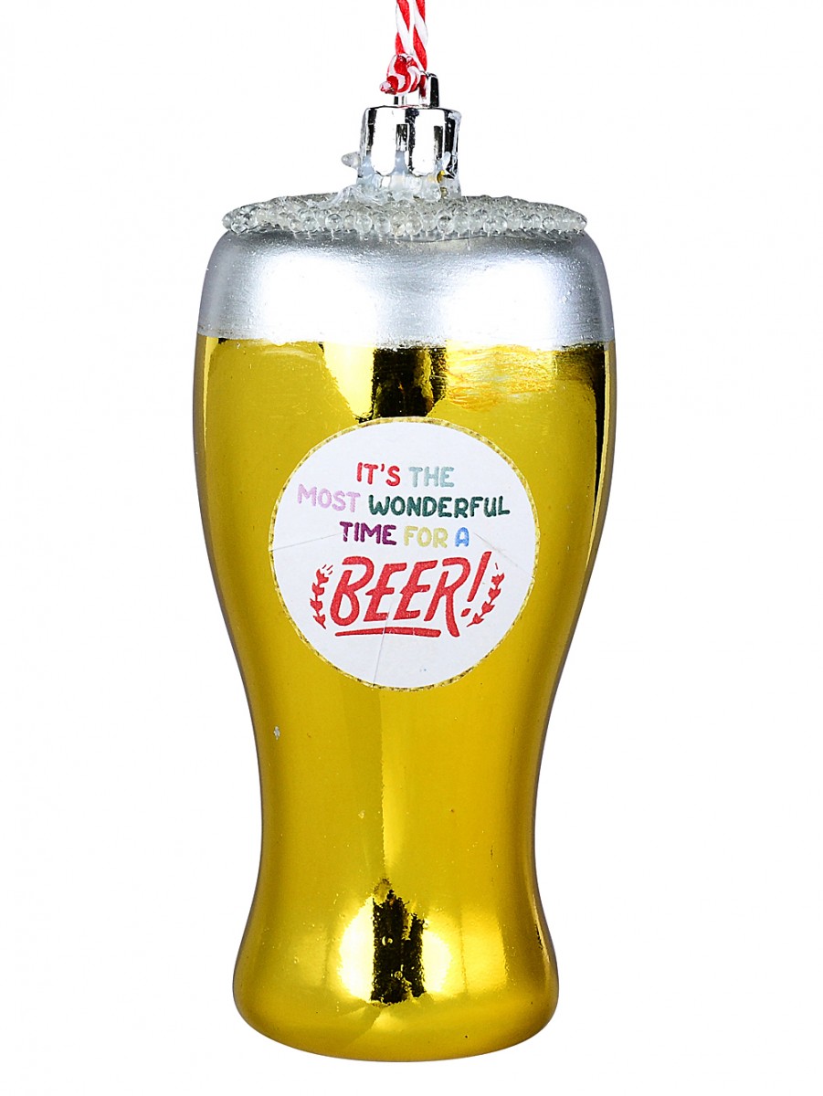 It's got a delightful label right on the side that reads �It's the most wonderful time for a beer�. Whether you like to keep things classic or add quirky surprises to your Christmas décor, this cheeky little schooner is bound to draw smiles from your family, friends and guests. Each beer glass is individually sold and measures a perfect 50mm x 50mm x 10cm. Hang it on your tree using the silver cap with red and white string for effortless decorating.