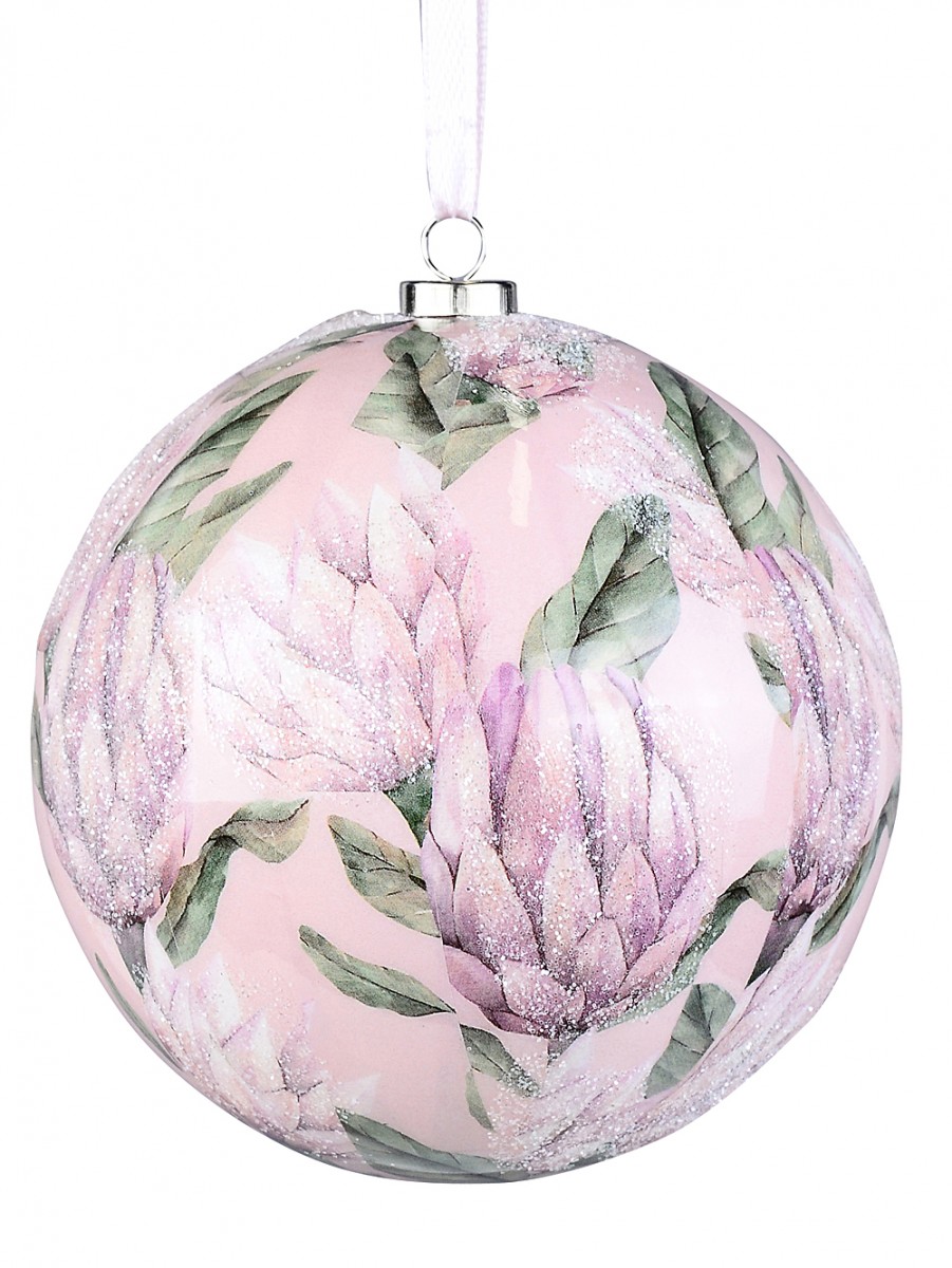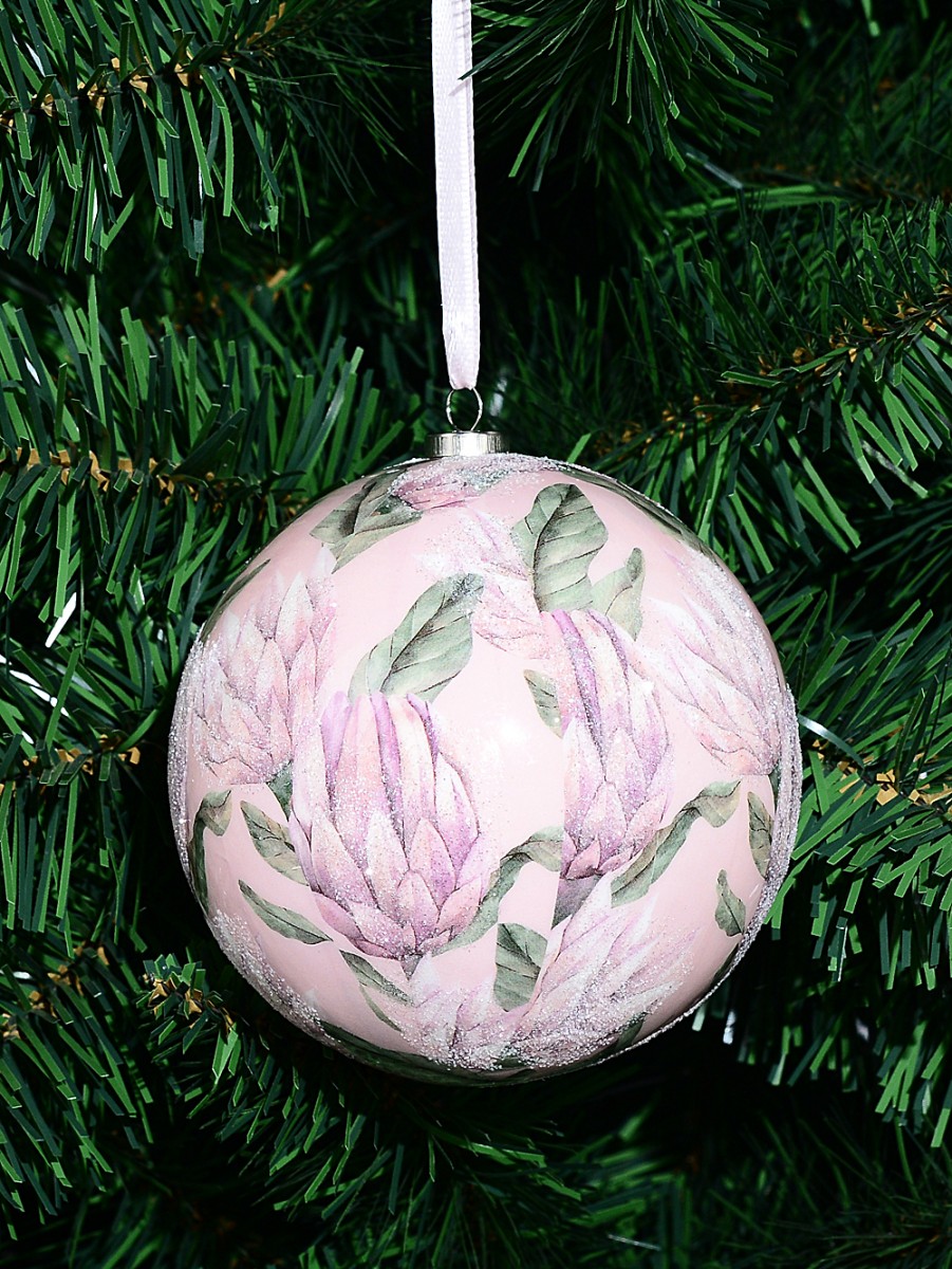 Our 10cm Waratah-Like Pink Ice Protea Flower With Silver Glitter Christmas Bauble (that's a mouthful!) is exactly the sort of ornament we love because - well, it's a proper showstopper. Not only does it have an incredibly pretty ice pink protea print topped with dazzling silver glitter, but it's actually inspired by Australia's beloved proteaceae family. So there are little nods to waratahs, banksias, and grevilleas too. These baubles are 10cm in every direction, making them just large enough to catch anyone's eye without feeling over the top. The sphere shape is perfect for classic holiday trees.