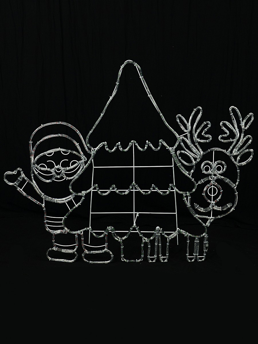 Our 1.2m Santa, Reindeer & Tree With White, Green & Red LED Twinkle Light Display is a great way to bring that magical Christmas cheer right to your front door. Or your lounge window. Or even the back garden, if that�s where you want to spread a little joy! Measuring 1.2m x 14mm x 99cm with a sturdy stand for easy displaying and five metres of black-cased lead wire, this cheery light motif glows with the warmest and coolest whites, greens, and reds - just what you need when you want something for both inside and out. The silhouette features an illuminated tree with Father Christmas waving on one side and a sweet reindeer on the other, both with twinkling accents throughout.