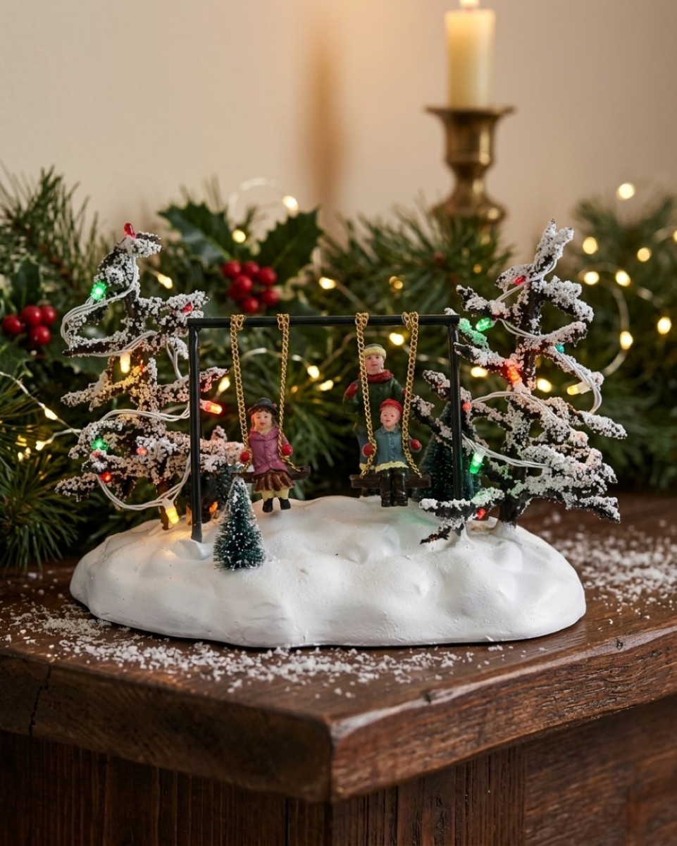 Bring a touch of childhood joy to your holiday display with this 14cm Animated Kids On Playground Swing. This hand painted resin ornament features a nostalgic winter scene where children enjoy a double bench swing, gently pushed by an older sibling. Set against a backdrop of snow-covered green trees, this piece captures the quiet magic of a snowy afternoon in a northern hemisphere home, making it a perfect addition to your growing Christmas village