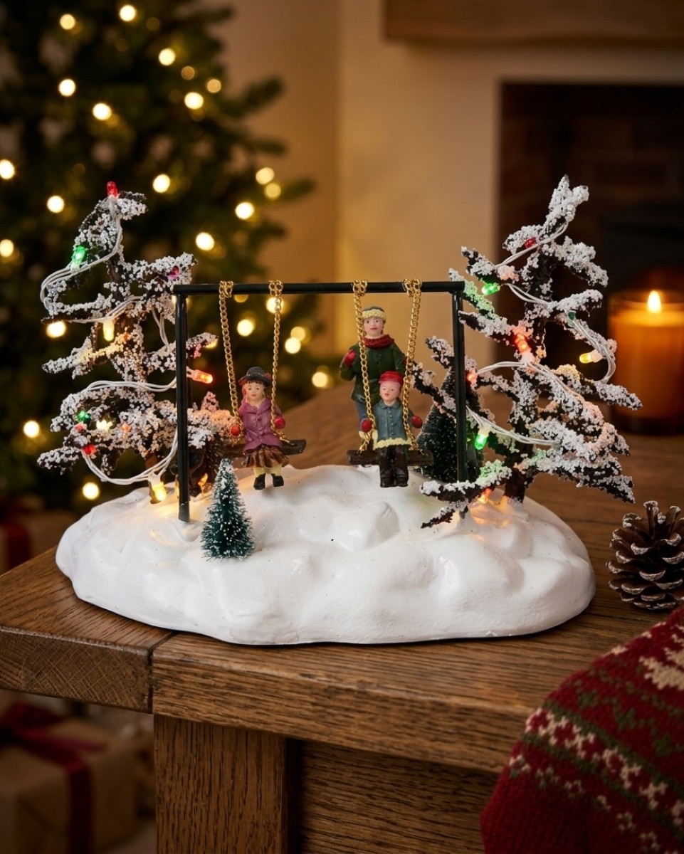 This animated Christmas village piece features a realistic rocking motion as the kids swing back and forth on their benches. To enhance the festive atmosphere, the surrounding trees are decorated with multi colour LED lights in red, green, and orange. These lights feature a lively flashing sequence that adds a dynamic glow to your tabletop display, while the white wire casing blends seamlessly into the snow-capped scenery