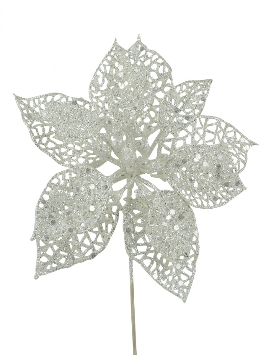 This cream Iridescent Filigree Poinsettia Pick is a great way to dress up Holiday table settings, stage or party decorations, Christmas trees, wreaths, gifts/packages or invitation cards and displays. You may even mix and match it with other luxurious, glimmering picks, pine, holly, garlands and the possibilities are endless.