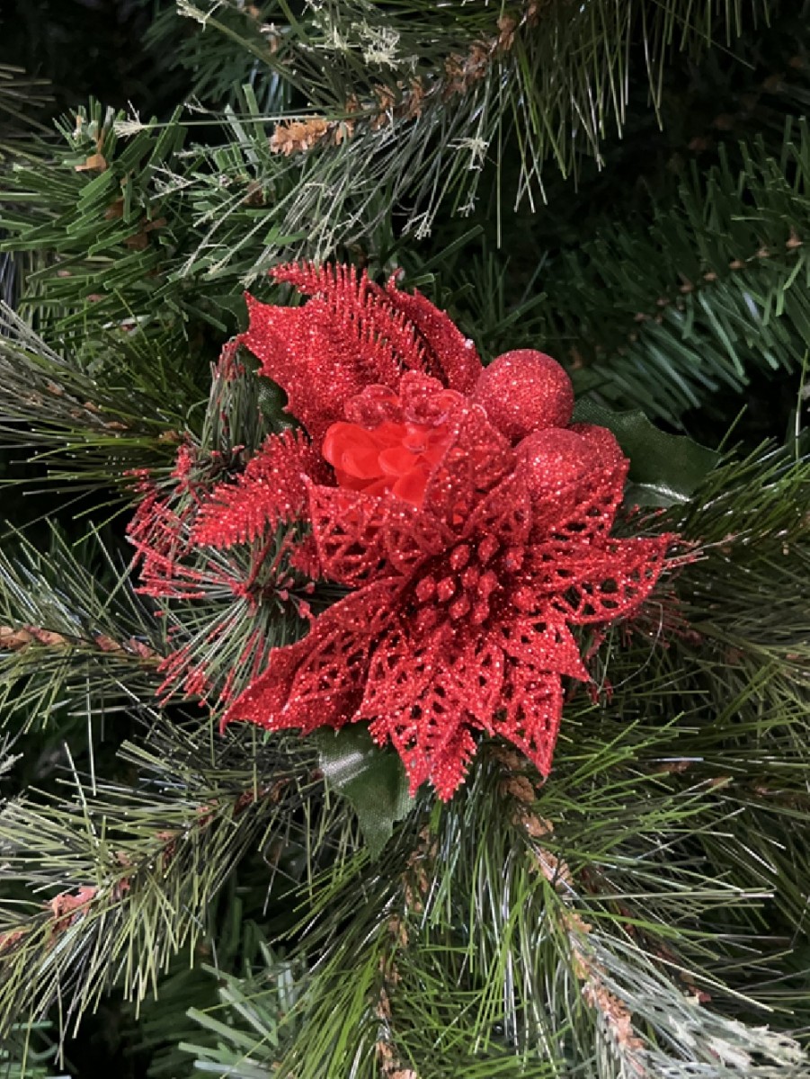 Delicate and charming, this festive red glitter pick displays seasonal beauty as shining red glittered poinsettia leaves and berries pop among nature-inspired elements. This artificial pick will provide your decor with magical Christmas wonderment and will look very pretty in a vase for the holidays that will be here before we know it!