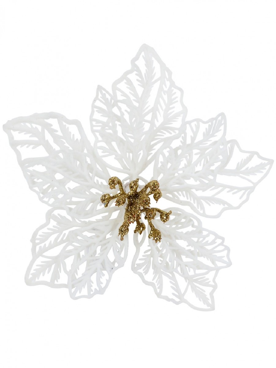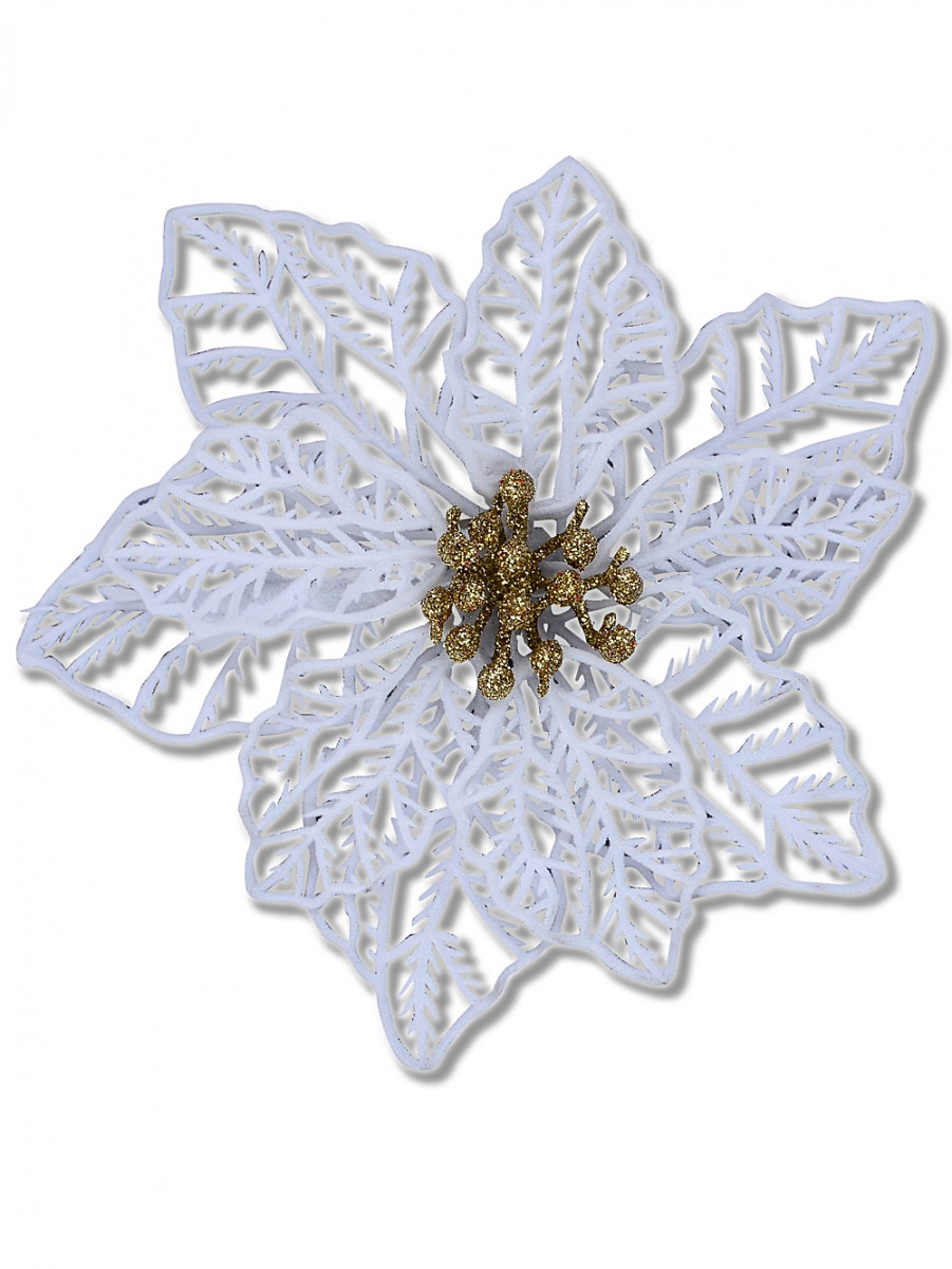 This white poinsettia flower pick features intricate details that make it ideal for decorating Christmas trees, wreaths, garlands, centrepieces, bouquets, and floral arrangements. The petals of this poinsettia have a classic design with a netted vein silhouette, creating an eye-catching look. The centre of the flower is adorned with gold glitter stamens, adding a touch of sparkle and sophistication to the overall design. One convenient feature of this decorative pick is the included alligator clip, which makes it easy to attach to various surfaces and arrangements. Whether you proudly display a real Christmas tree or prefer the convenience of a faux one, this poinsettia pick allows you to infuse your home with natural elements, creating a relaxed and homey ambiance during the holiday season.