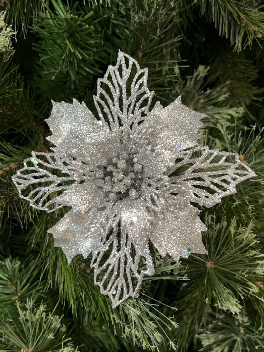Did you know that in Mexico where the poinsettia flower has been a part and parcel of Christmas celebration since as early as 17th century, the poinsettia flower is often called 'Christmas Eve Flower'? And just like its name, you can use this beautifully crafted Silver Glittered Poinsettia Pick With Two Style Leaves to spice up your Christmas decoration.