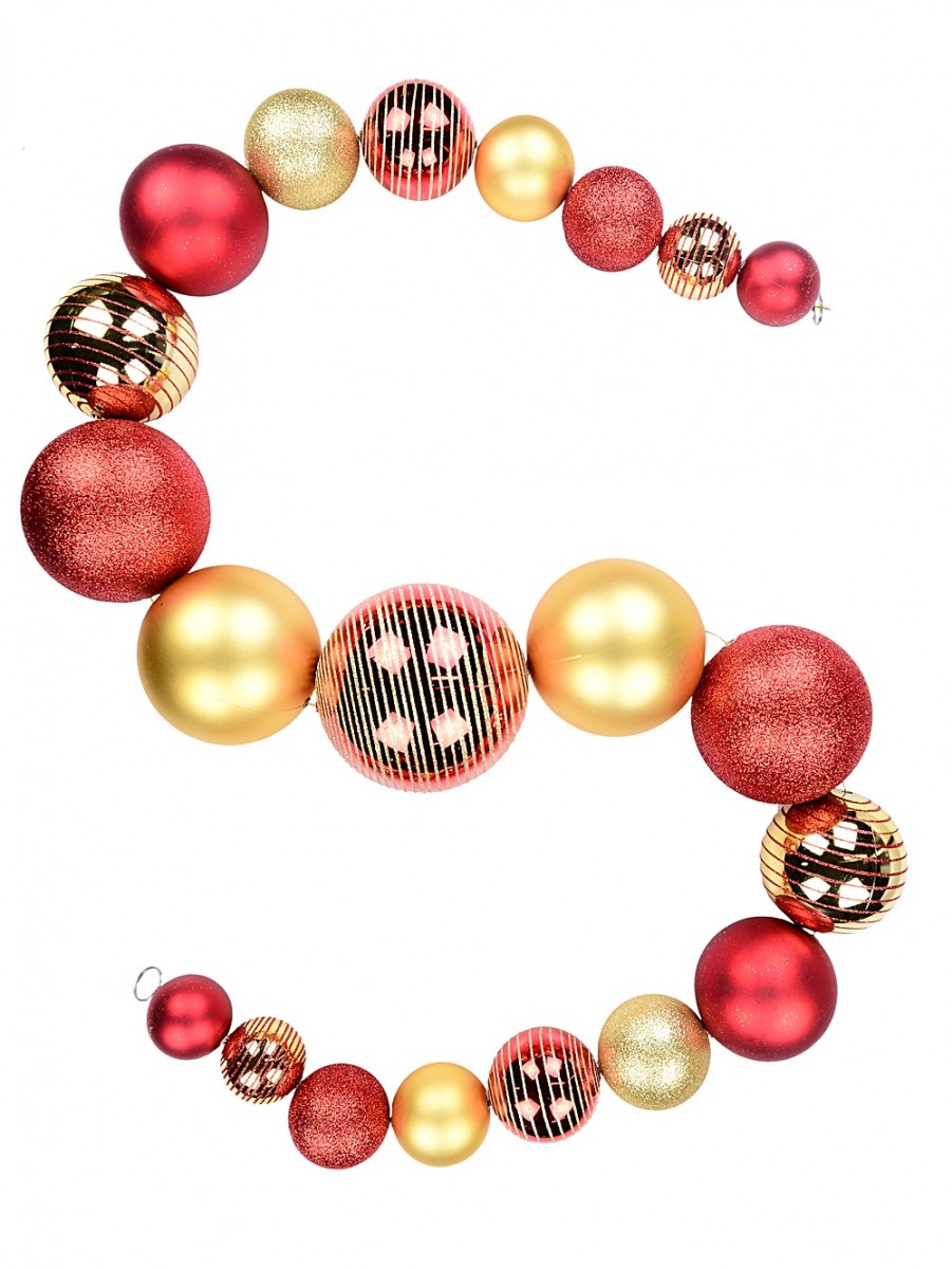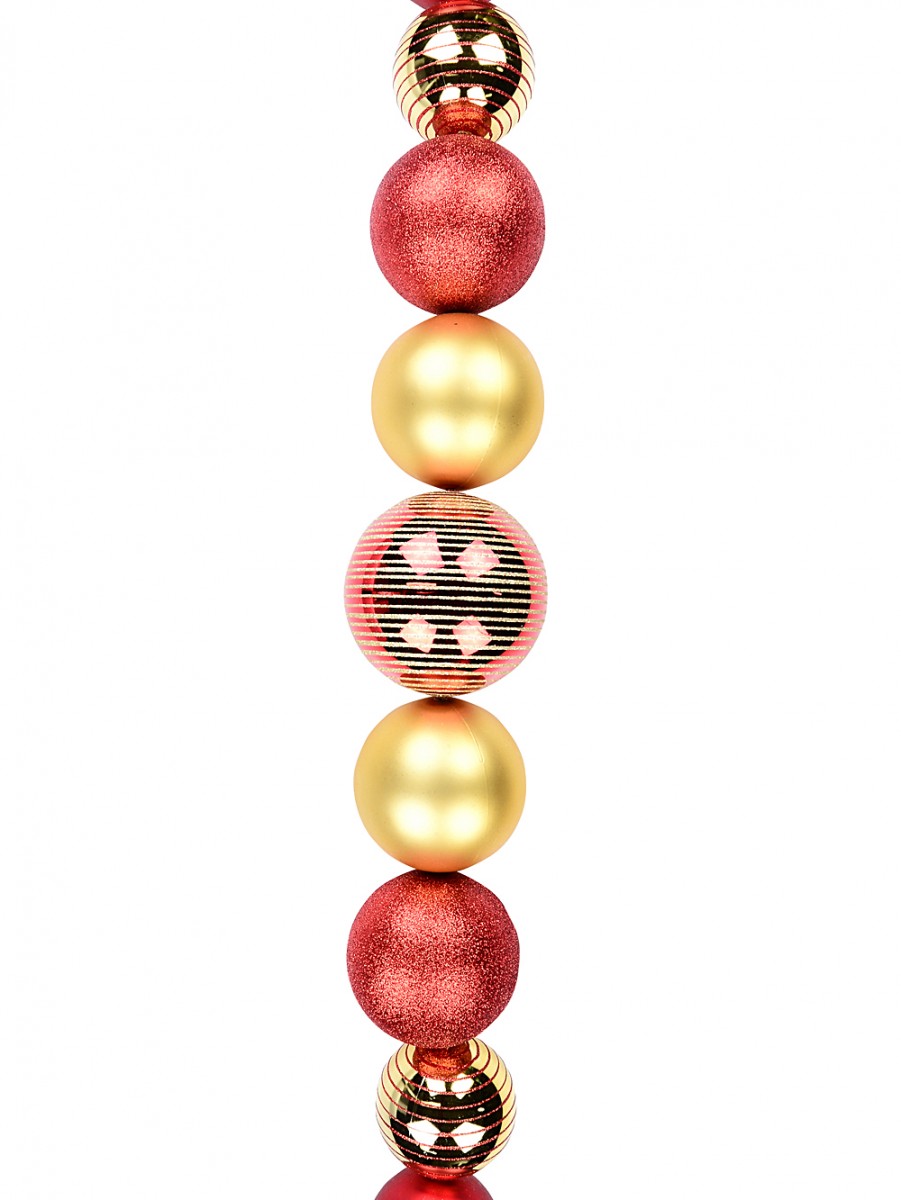 This lively red and gold necklace shaped garland provides an easy and excellent way to get everyone in the holiday spirit! The embellishment has a large metallic red bauble with gold glitter striping in the centre followed by an alternate pattern of baubles in gold pearl, red glitter, red and gold glittered, metallic red and gold glitter on each side.