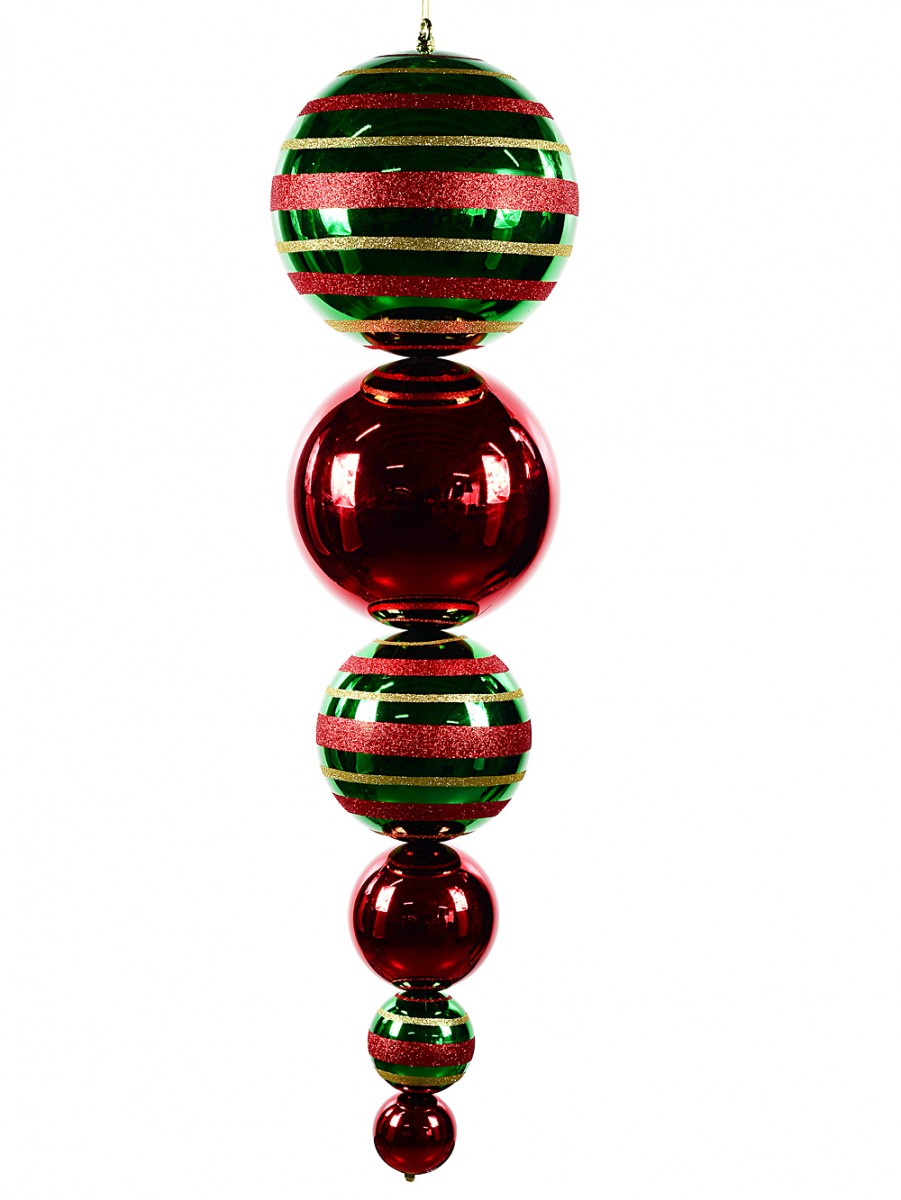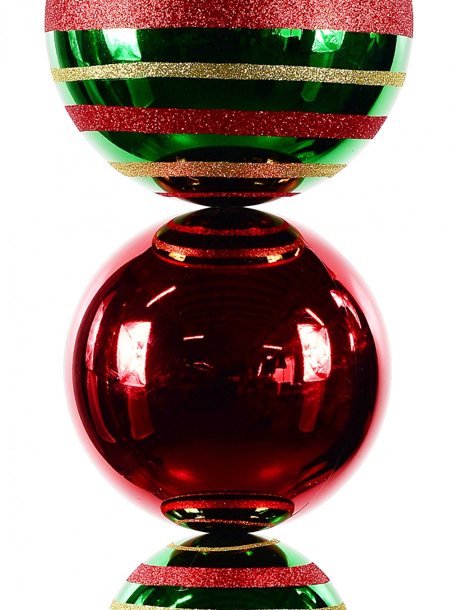 We love that the shape descends in size from top to bottom, with 28cm, 25cm, 20cm, 15cm, 10cm & even a sweet little 8cm finishing bauble. It's got giant shiny green baubles embellished with red & gold & red glitter stripe bands and also shiny red elements, all topped with a matching gold cap and string for easy hanging. Glitter is meticulously hand painted onto the decoration so each one is unique - how good is that! These are a brilliant shatterproof design so you won't have to worry about them falling off the tree or down from the ceiling if you've got little ones and pets running around during the silly season.