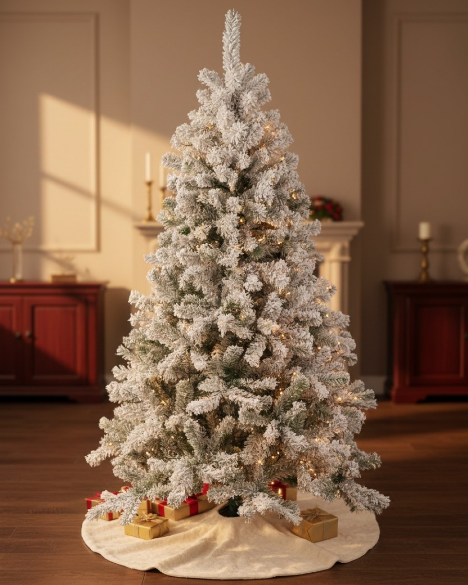 Bring the magic of a fresh snowfall to your grandest festive displays with the Dawn White Heavily Flocked Christmas Tree. Standing at a majestic 2.3m tall, this tree features a deep green fir base heavily coated in a non-toxic, industrial-grade snow material for an authentic winter wonderland appearance. Expertly crafted with 1144 tips, it provides a dense and multi-dimensional silhouette that serves as a spectacular canvas for your indoor and outdoor festive lighting