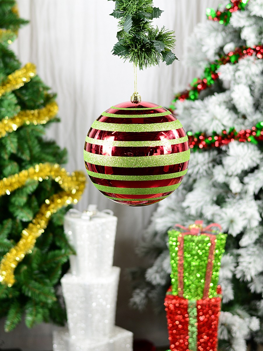 This cleverly crafted Christmas tree bauble would add an ornamental feel of originality to your Christmas decoration this year. It is an irresistible ornament with an outstanding look achieved through its savvy choice of alluring colours and glittered spray. The extra-large bauble is made in a vibrant, glossy red colour with nine green glittered horizontal stripes across the spherical frame. It looks dazzling particularly because of the glittered green stripes. This is why it will blend in perfectly with your Christmas decor since it is coloured in two of Christmas traditional colours. Place your order now as we soon may run out of stock for this amazing ornament.