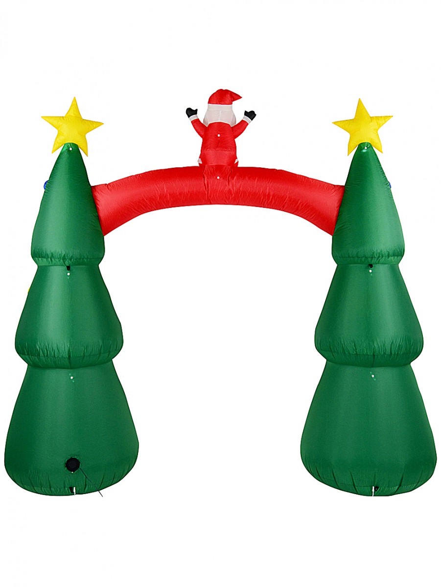 Ah, nothing says 'Christmas at our place' quite like a bright, cheerful archway! Our 2.5m Santa On Decorated Trees Arch Illuminated Inflatable is the kind of decoration that gets your family grinning before they're even inside the door. And we're not even kidding - there's a jolly Father Christmas sitting right on top with his arms up, wearing his classic red suit, surrounded by lush green Christmas trees covered in gifts, bows, candy canes and baubles of every colour! We always find the yellow star toppers just make the whole thing pop.