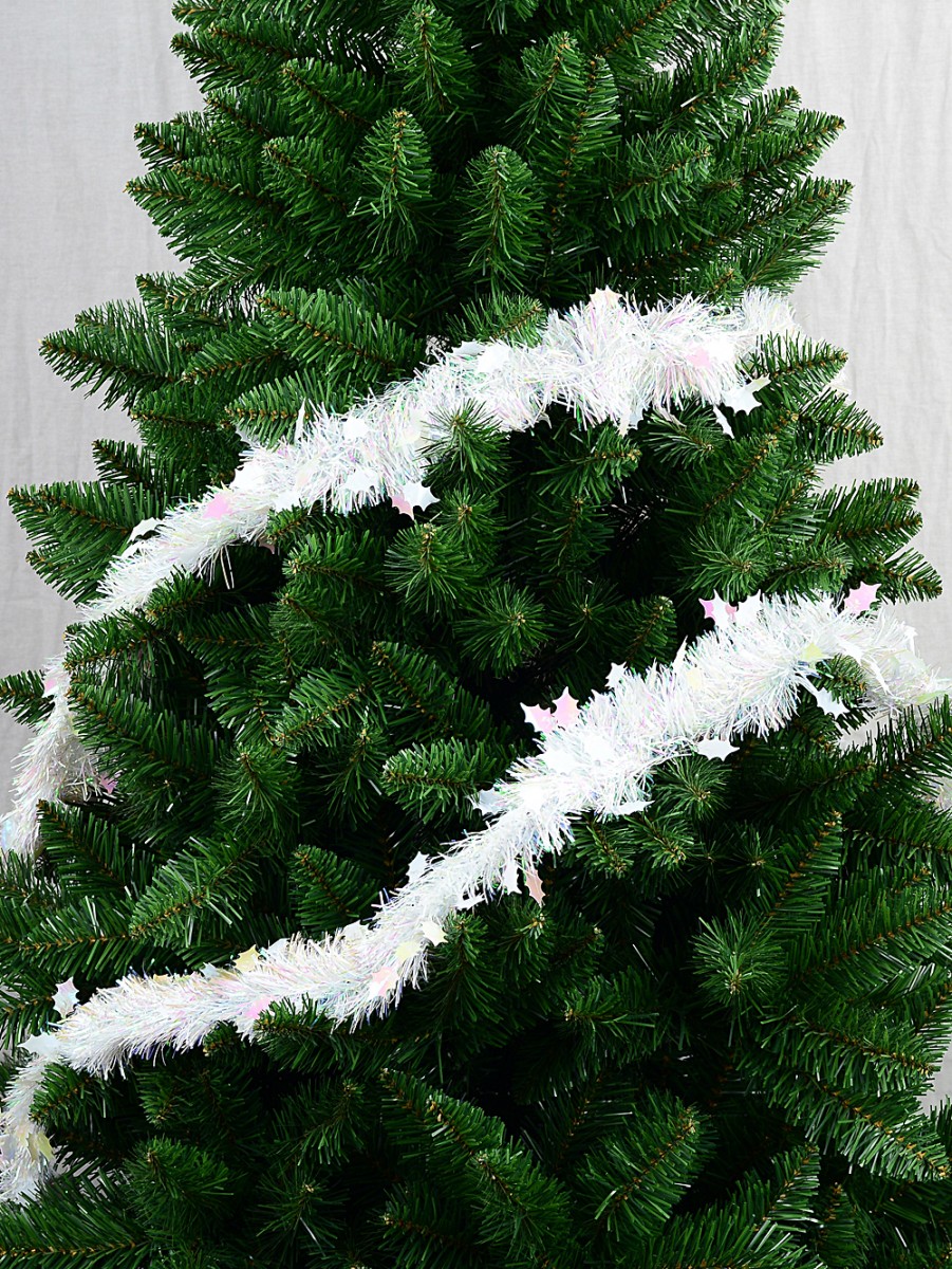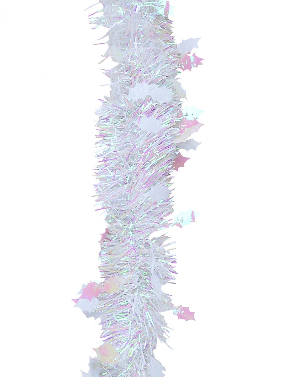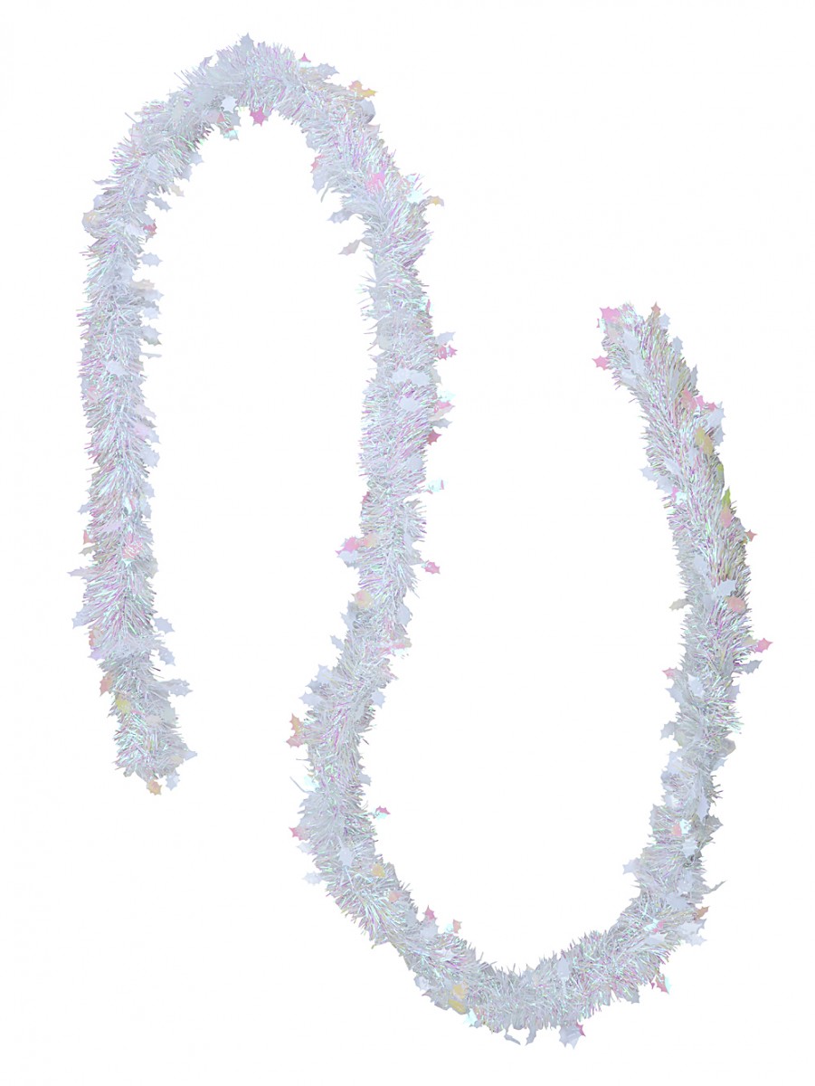 The White & Iridescent Holly Leaf Pine Needle Tinsel Garland is a unique take on the ordinary strand of tinsel that is inspired by nature but shiny like a Christmas decorations. Why deck the halls with plain tinsel like everyone else when these sparkly little holly leaves are so much prettier. The iridescent ropes of white tinsel appear to have a foliage of white holly leaves growing out of the end of each strand. As the light hits each shiny holly leaf and pine needle they reflect back into a different shades of colour. The White & Iridescent Holly Leaf Pine Needle Tinsel Garland would look wonderful wrapped around the edges of rooms and large objects, or draped from the ceiling at regular intervals. Doubling up each individually sold garland with a string of Christmas lights would lend to the twinkly air of the decoration, especially if they were blinking. Perfect for decorating nearly any room indoors or outdoors.