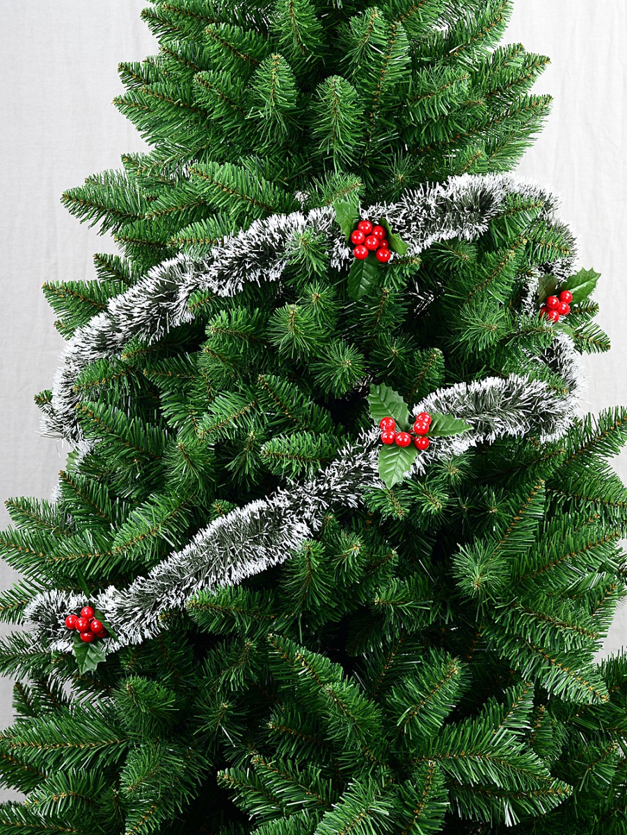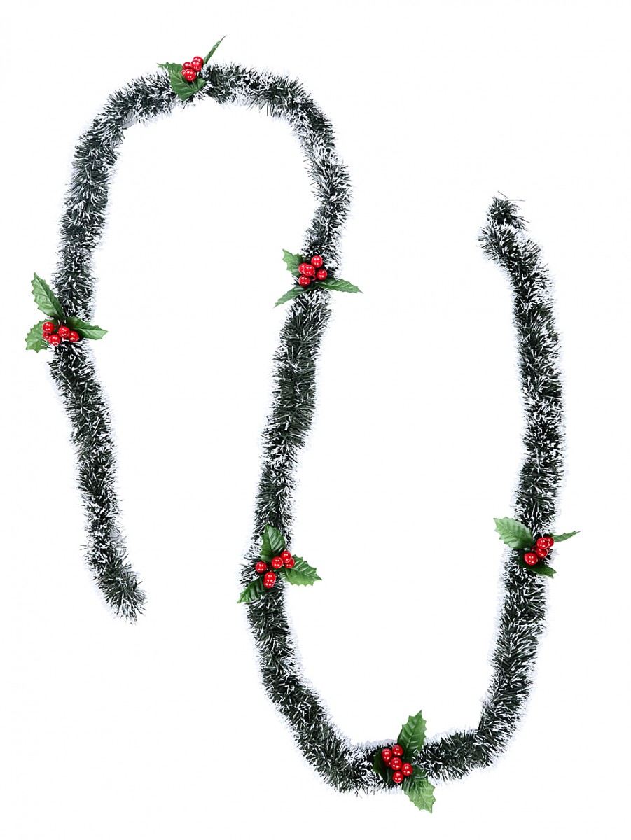 Green tinsel with holly and white tips is a modern take on a classic look that will never die or make a mess of pine needles everywhere. Where else in nature would holly berries and leaves grow out of evergreen branch anyway? This evergreen coloured tinsel has white tips that give the impression of snowfall, even in the Christmas season of the Southern hemisphere. Each individually sold stand in bedecked with faux holly leaves and berries spaced at regular intervals. This green tinsel with holly and white tips is good for wrapping around the edges of large objects such as stairwells, porches and patios, doorways, or around the walls near the ceiling. The tinsel lends a festive air to the room be it indoors or outdoor, especially when paired with a strand of twinkling Christmas lights. The green tinsel with holly and white tips is perfect for the ambitious Christmas decorationsator who is lining their entire home or place of business.