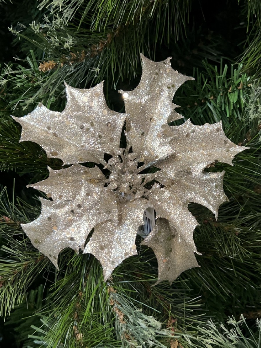 This spellbinding pick is of a poinsettia flower design on a single long stem, having all petals covered in gold glitter with small gold round confetti in the centre and black sequined embellishment to complete the look. It is 28cm in length and 17cm in width and is a great way to decorate and add some bling to your Xmas tree or display.