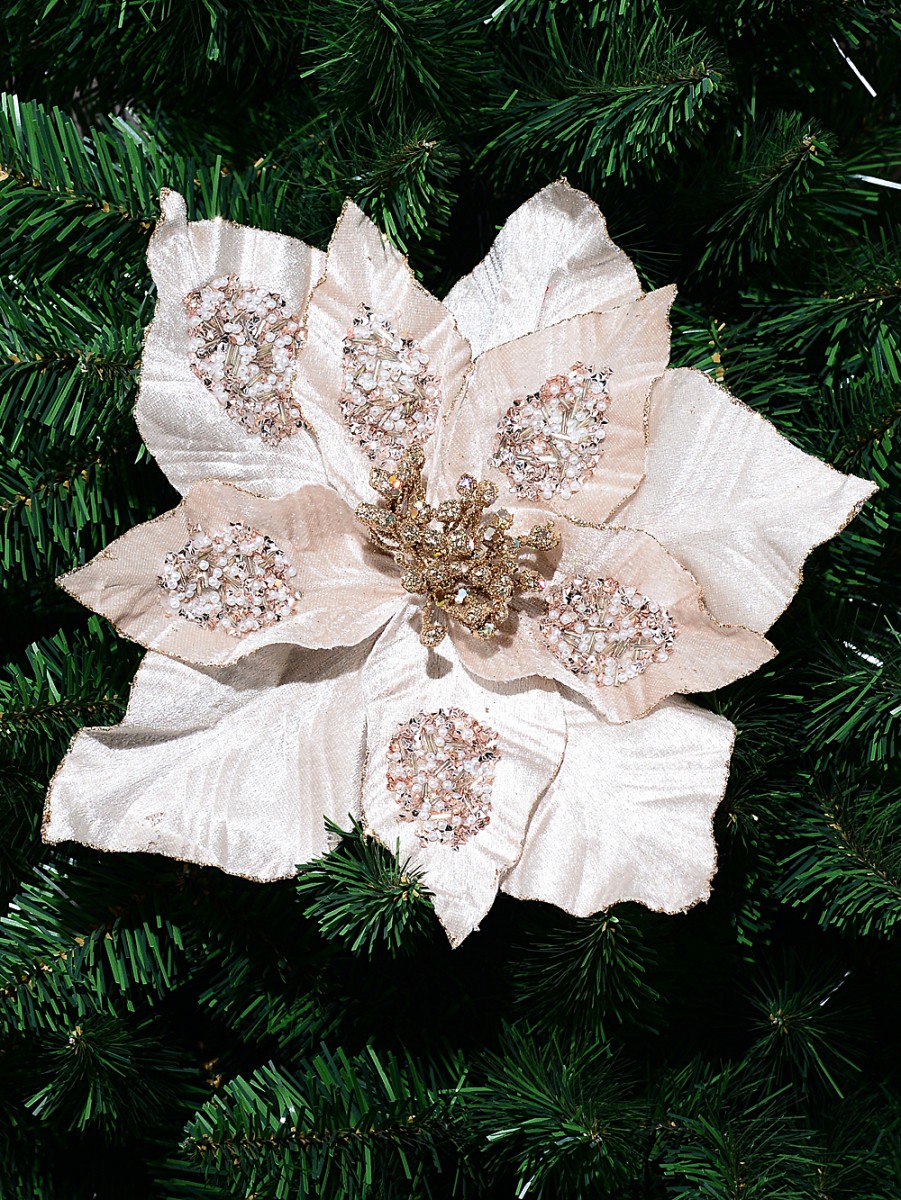 Some bracts are plain and velvety, while others have a stunning centre decoration with white pearls, rose gold sequins, and these delicate clear bugle beads. The middle is finished with a big sequin-and-glitter bloom in champagne tones - it draws your eye in right away. The wired bract makes it really easy to shape on the tree (or wreath or garland, if you want).