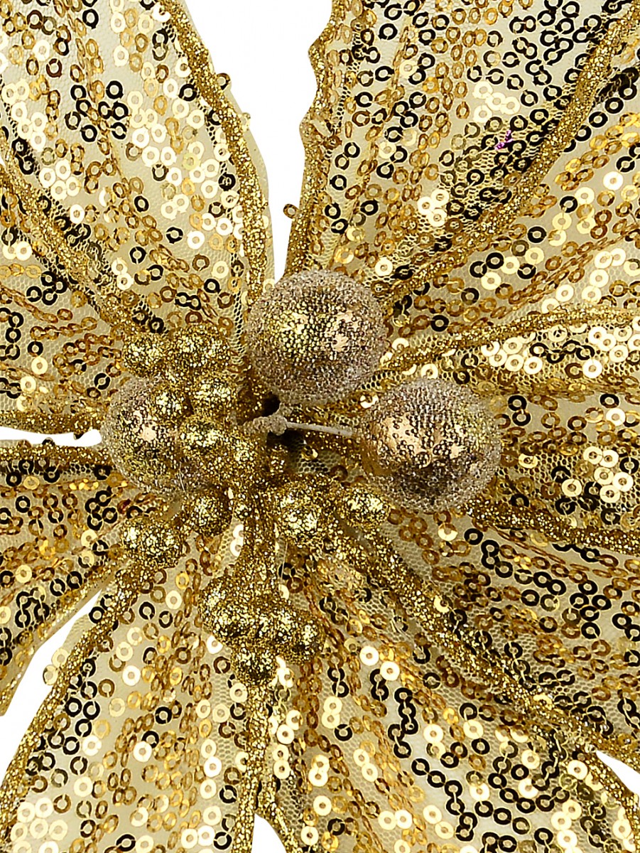 Attaching these couldn't be easier. There's an alligator clip right on the 15cm stem, so you'll find these slot in perfectly with other flowers and trimmings on trees, garlands or table centrepieces - wherever you want to spread some shimmer. They're also really impressive at a festive lunch as napkin holders! And don't worry if you see a bit of sequin or glitter dropping when unpacking and sprucing (we've noticed it too) - it's totally normal with these highly detailed flowers.