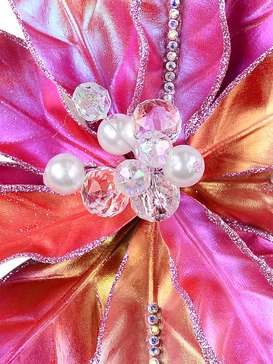 This isn't just your average Christmas flower clip. It's both dainty and dramatic, combining matte hot pink iridescent bracts edged with pink glitter and shimmering midrib diamantes. There are two petal styles that set it apart: one with glittery edges plus diamante lines, and the other, also edged in glitter but without the bling down the middle. We especially love that alligator clip on its 10cm stem for super easy decorating - great if you're using it in floral arrangements or bouquets too!