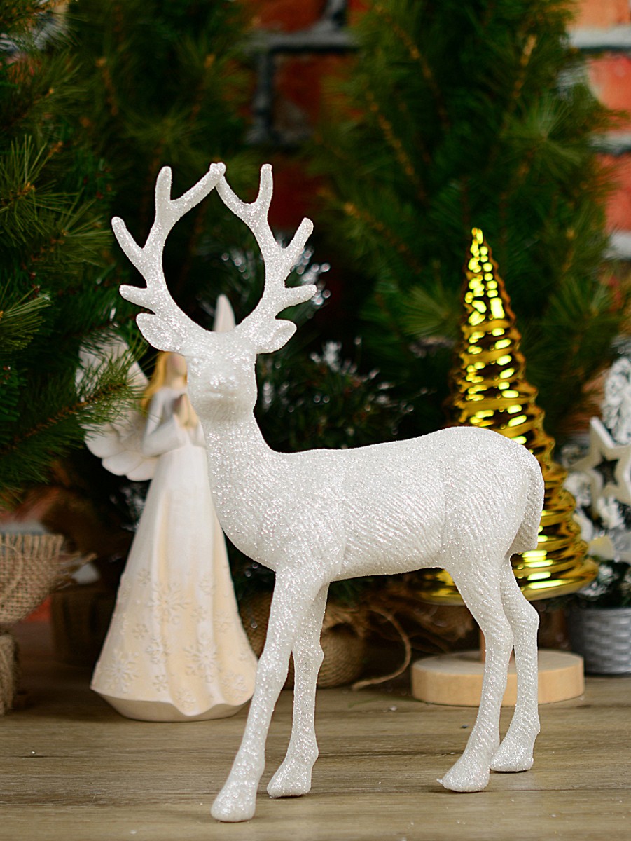 Crafted with meticulous attention to detail, the reindeer boasts a strong, dignified posture, its antlers highlighted with a subtle silver glitter that catches the light beautifully. The blend of white and silver makes it a versatile addition to any holiday theme, complementing both traditional and modern decor.