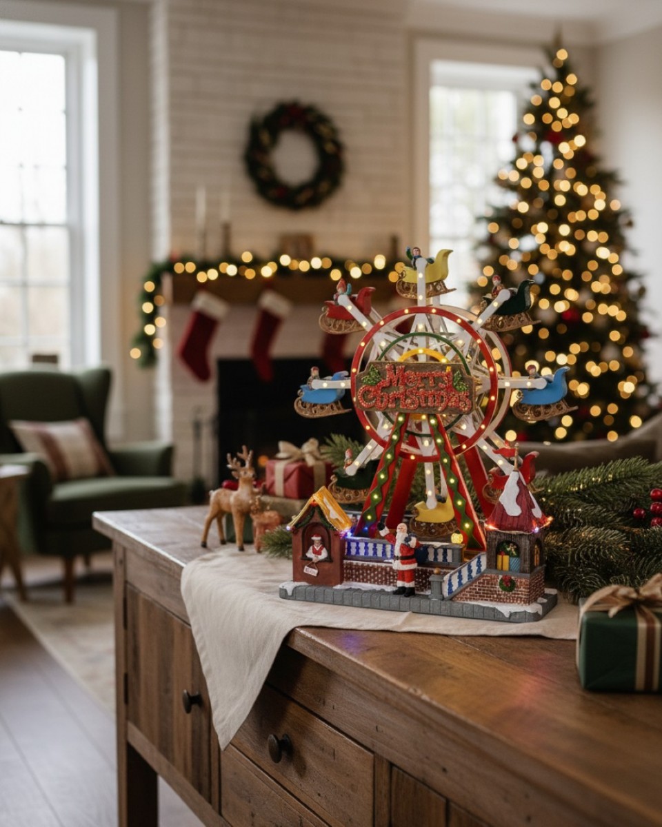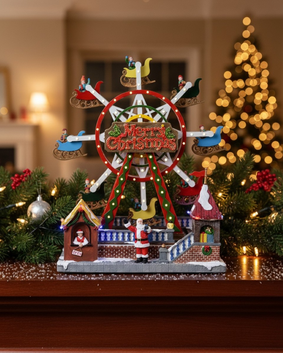 This animated village piece features a continuously rotating Ferris wheel that provides constant movement to your display. To enhance the festive atmosphere, the unit plays a medley of classic Christmas carols, including 'Rudolph the Red-Nosed Reindeer'. With a convenient three-way switch located on the back, you can choose between 'Lights Only' for a quiet evening glow, or 'Lights & Music' for full festive entertainment