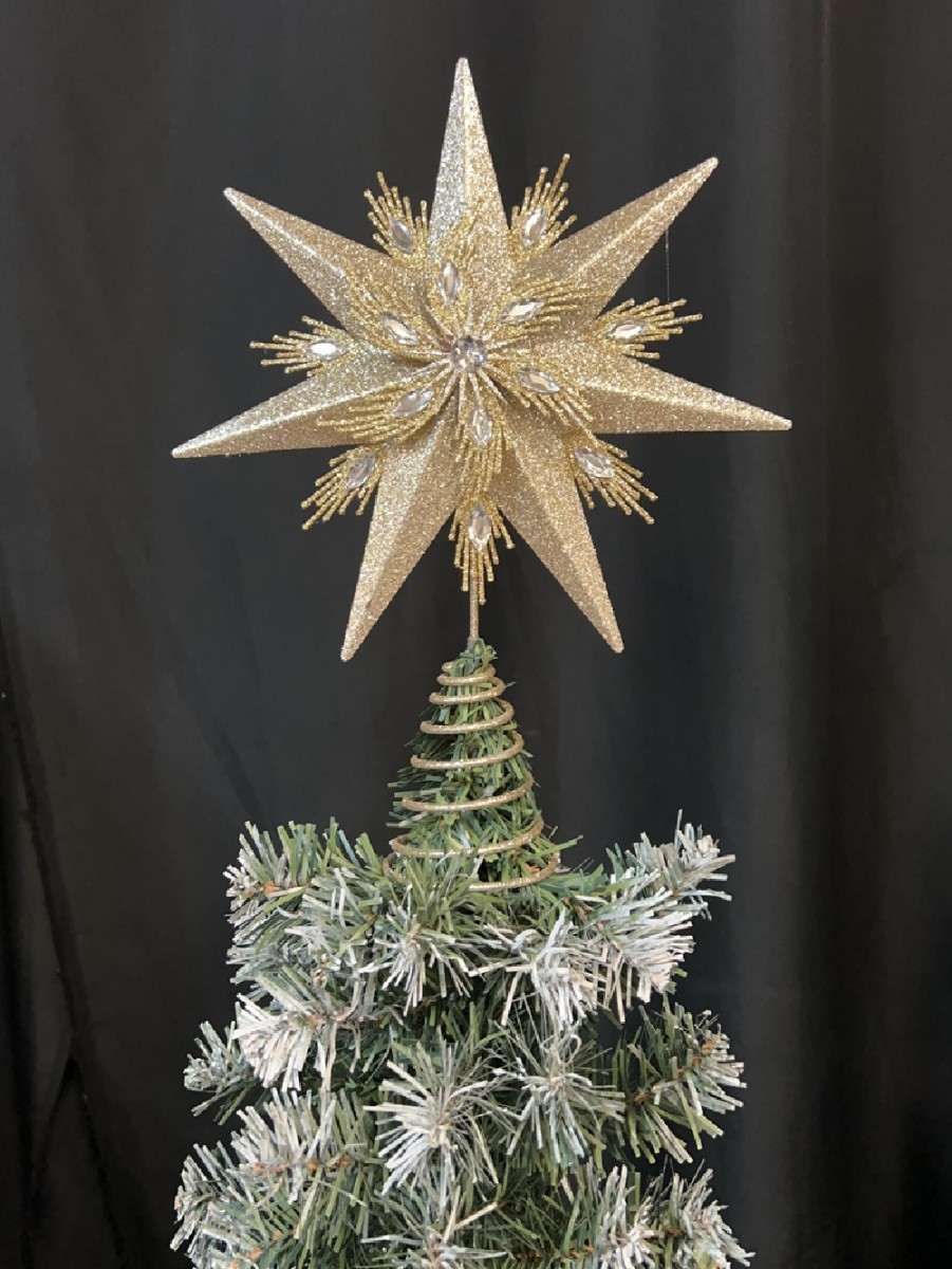 This eye-catching champagne-coloured gold glitter tree topper has a unique star design with decorative gold pieces and jewel embellishments that will give any tree a stunning look! Freestanding due to the coiled base, this topper can also be used year-round as a unique centrepiece or a splendid adornment on the display shelf or mantle.