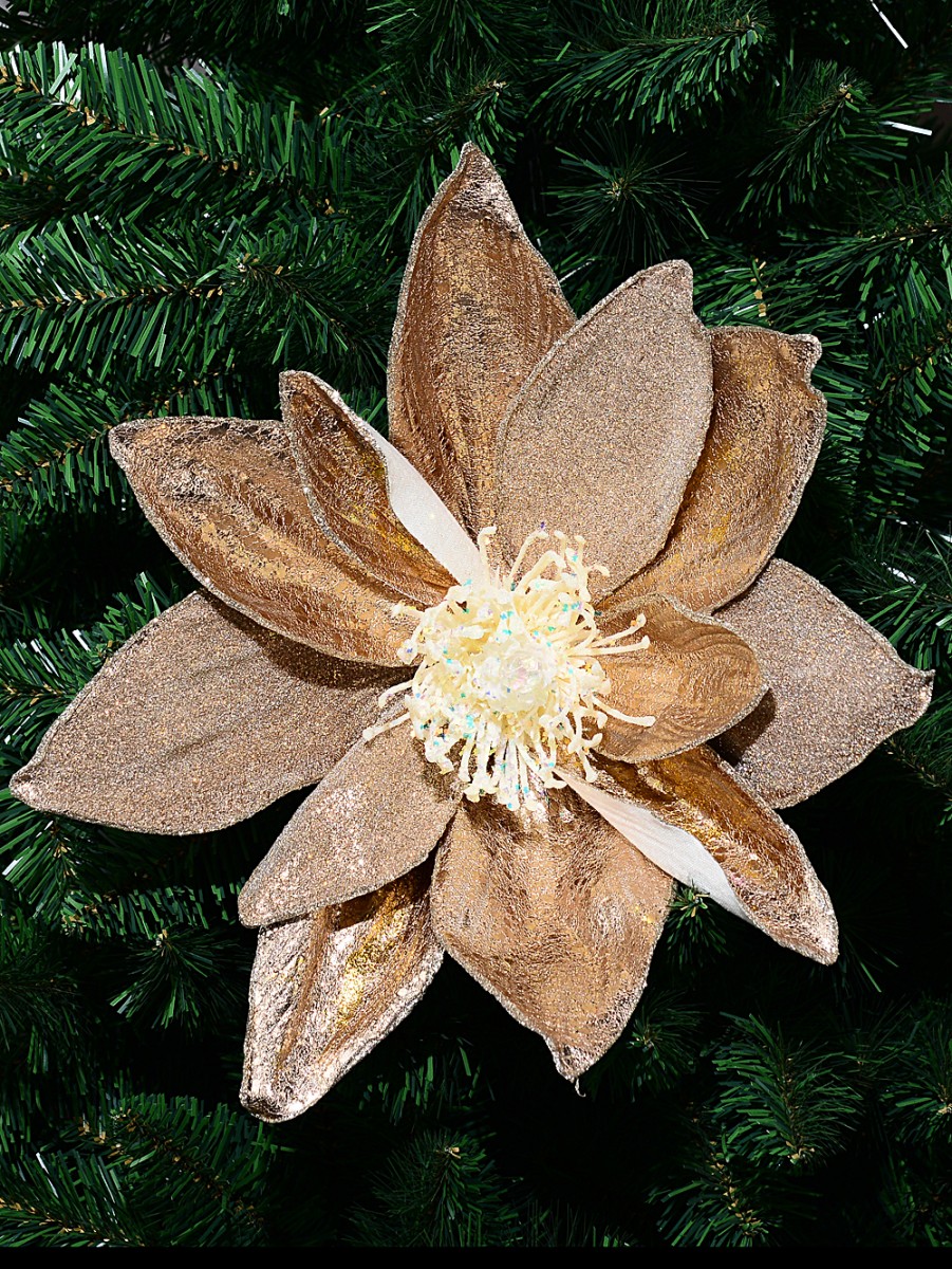 These magnolia picks are pretty big too - measuring around 36cm across and 18cm high - so they'll stand out no matter where they're placed. Great for trees, wreaths and even centrepieces. Each flower has several petal styles, including this amazing textured netting vein and a bit of gold distressing that catches the light beautifully. Wired petals let you adjust the flower shape easily, while the white centre with iridescent glitter and sequins is pure Christmas magic. And, if you're anything like us, you probably enjoy a bit of sparkle finding its way on the floor - it is part of the charm!