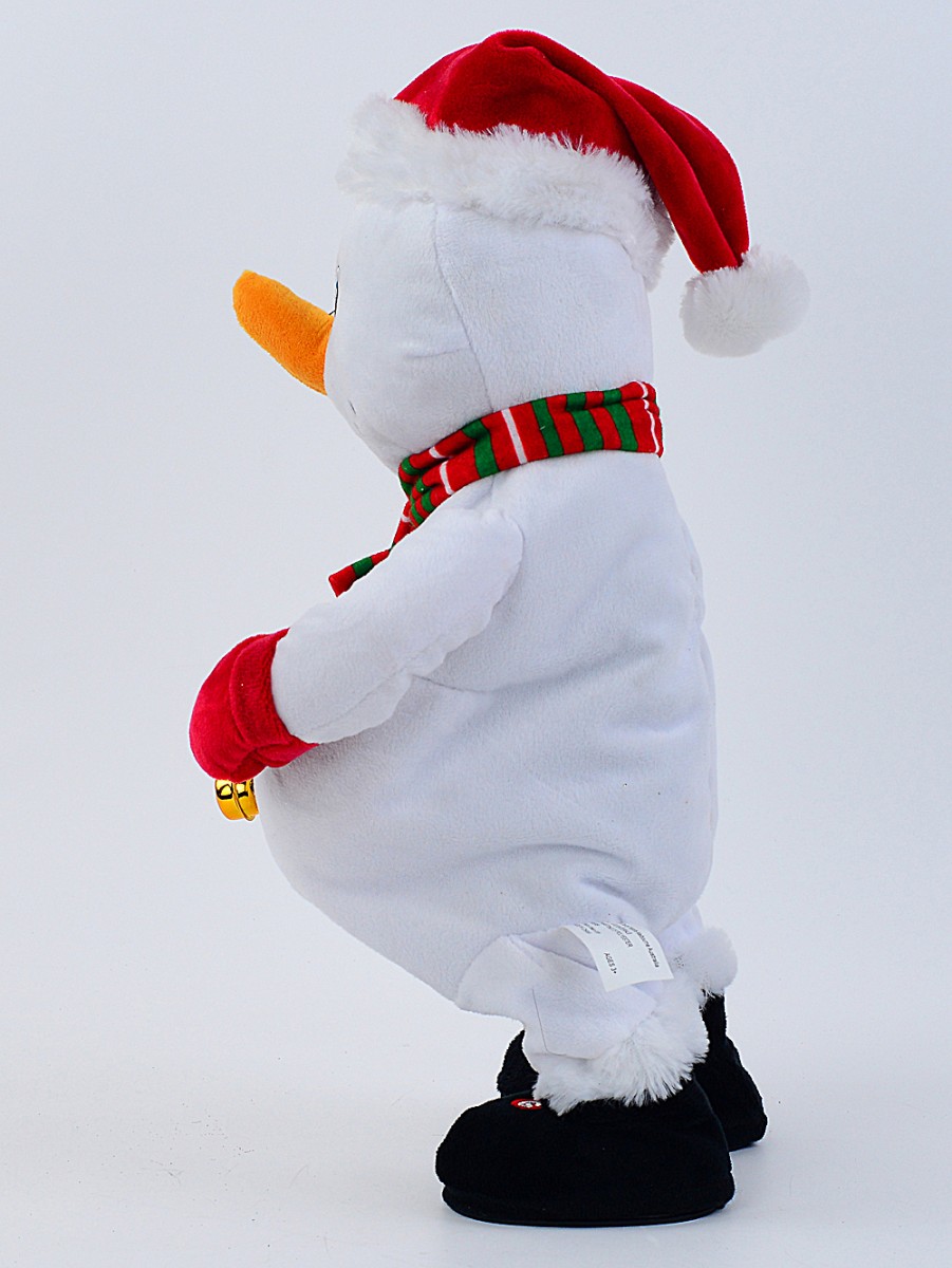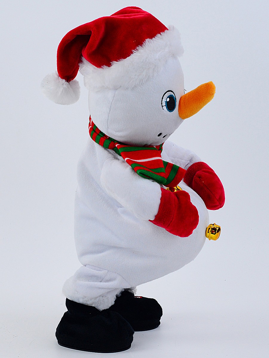 Every push of the button on Frosty’s black boot will have him busting a move to “Shake Your Groove Thing.” He might even get you and your guests up off your feet to join him! He wears his festive best, too - his red-and-white Santa hat has a faux fur cuff and pom pom to match his bright red gloves. The green-and-red striped scarf brings it all together (and gosh those shiny gold bells are so fun)! A soft white tummy and sweet carrot nose? It’s all too cute. Snowman animation does vary slightly with each one (so does the face) - it makes every single toy unique.