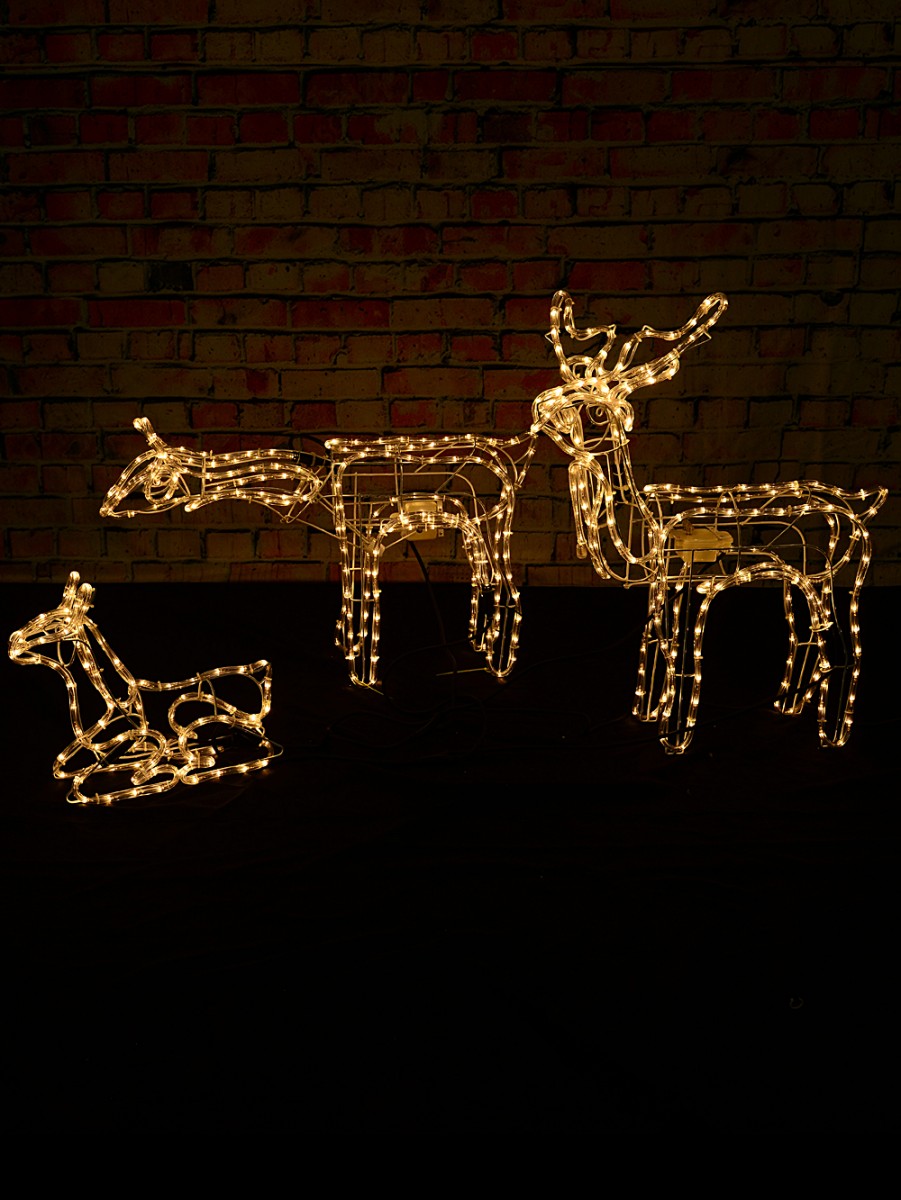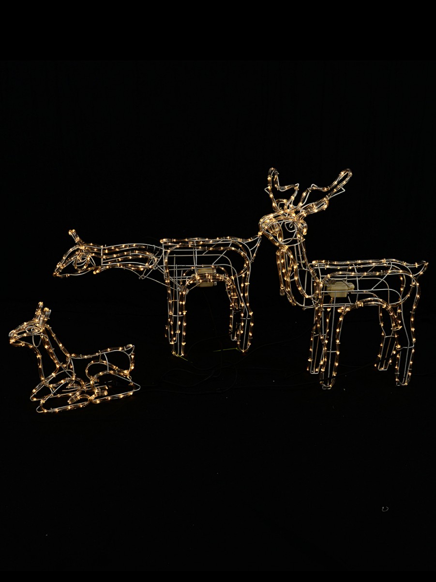 Our set of three-dimensional reindeer family display is an elegant and classy decoration with bright white LED lights throughout the rope tube fixed on a robust metal frame. Sold as a set of three which includes an animated 70cm x 34cm x 77cm bull with a side to side moving head, a 67cm x 17cm x 46cm cow with a head that's moving up and down and a 45cm x 10cm x 34cm sitting calf. The mains voltage plug with 3m lead wire must be mounted indoors or in a weatherproof socket. This product can be used indoors or outdoors and complies with Australian safety & performance requirements.