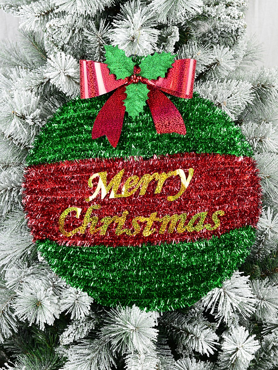 The plaque includes a red holographic bow, green glitter holly leaves, metallic red and white iridescent striped candy canes and even a metallic green present with a red ribbon and bow! And with dimensions of 43cm x 70mm x 46cm, this bauble tinsel plaque is perfect for hanging on your front door or even to decorate your Christmas tree.