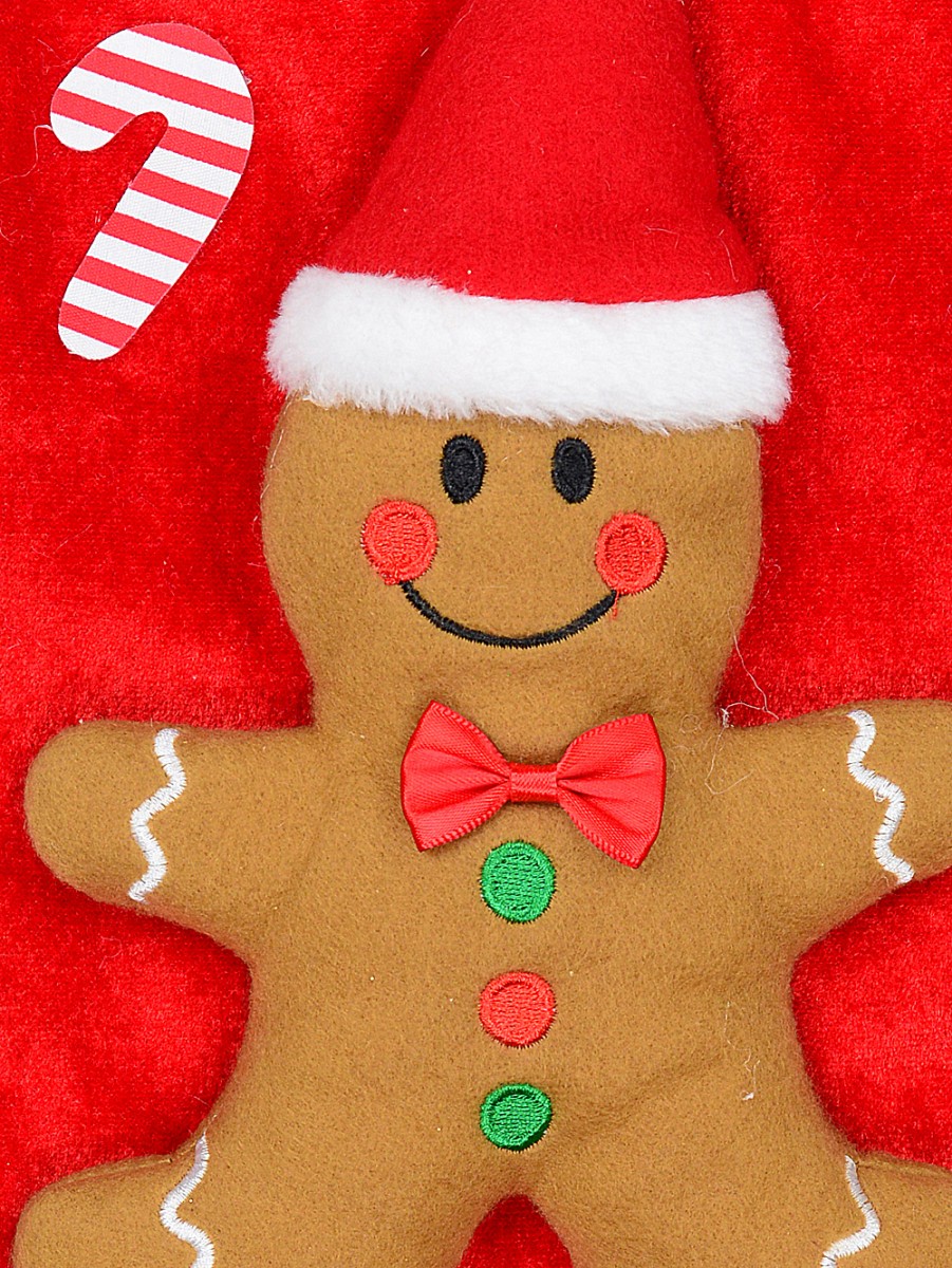 We adore its vibrant red colour, crisp white faux fur sock cuff, and that adorable 3D gingerbread man cookie face smiling out with rosy cheeks, festive buttons, and proper personality. Soft-to-the-touch and fluffy - the three-dimensional cookie is wearing a Santa hat and bowtie! Not to mention those striped red and green candy canes adding even more Christmas magic. Great for filling up with sweet little treats or just delighting everyone who passes by. Sold individually.