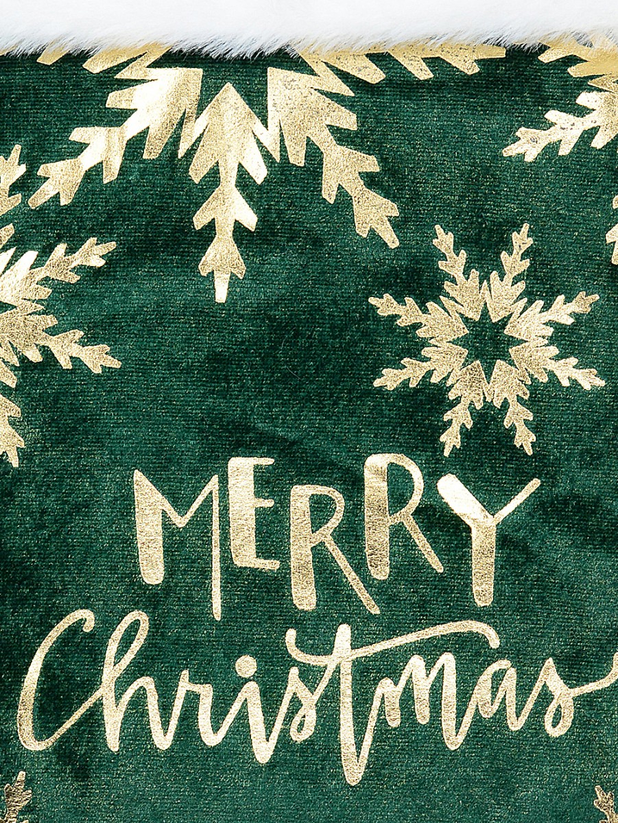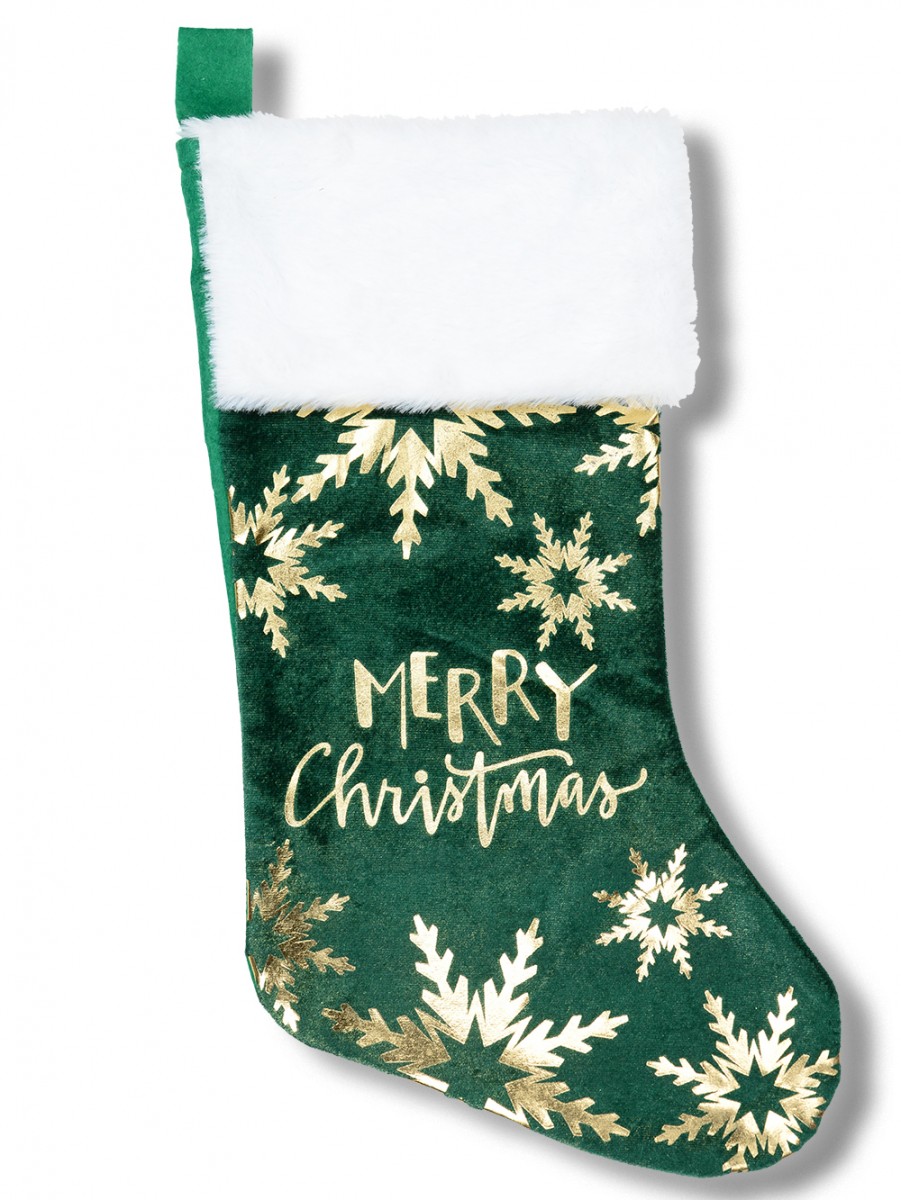 The luxurious emerald green velvet looks so lush with its gold 'Merry Christmas' print and delicate snowflakes. It's a bit fancy, but not too much. Measuring 26cm x 45cm, it's generously sized - proper room for Santa's little surprises and treasures. We love how the soft white faux fur cuff adds a touch of warmth to the sparkle and shine. That green felt loop makes it easy to hang anywhere you want to bring in holiday cheer.