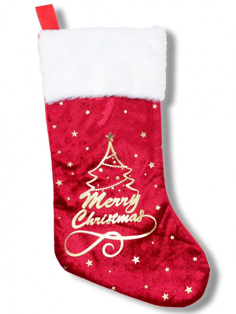 We think the velvet fabric is a huge part of its charm - it's got this gorgeous plush feel that looks so inviting and the gold print with its Christmas tree design and twinkling stars just glows against the deep red. It's finished with a super soft white faux fur cuff and has a sturdy little felt loop for easy hanging - plus there's plenty of space inside for Santa's special treats. Everyone loves stockings - especially when they're as festive as this one!