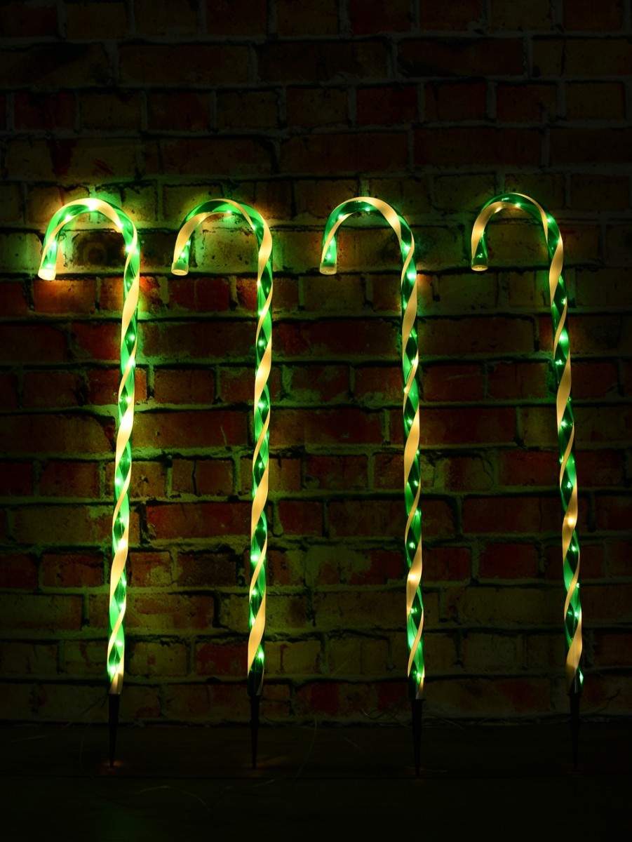 Sold as a pack of 4, the Green & White Candy Cane Christmas Garden Path Lights gives you the opportunity of decorating not only interior spaces but also outdoor locations such as the path from your garden leading up to the house's entryway. These four candy cane garden path lights can be inserted into the soil at 90 centimetres apart along the garden path leading up to the door.