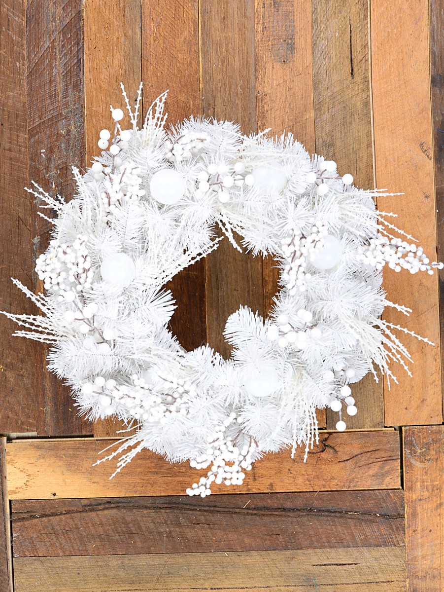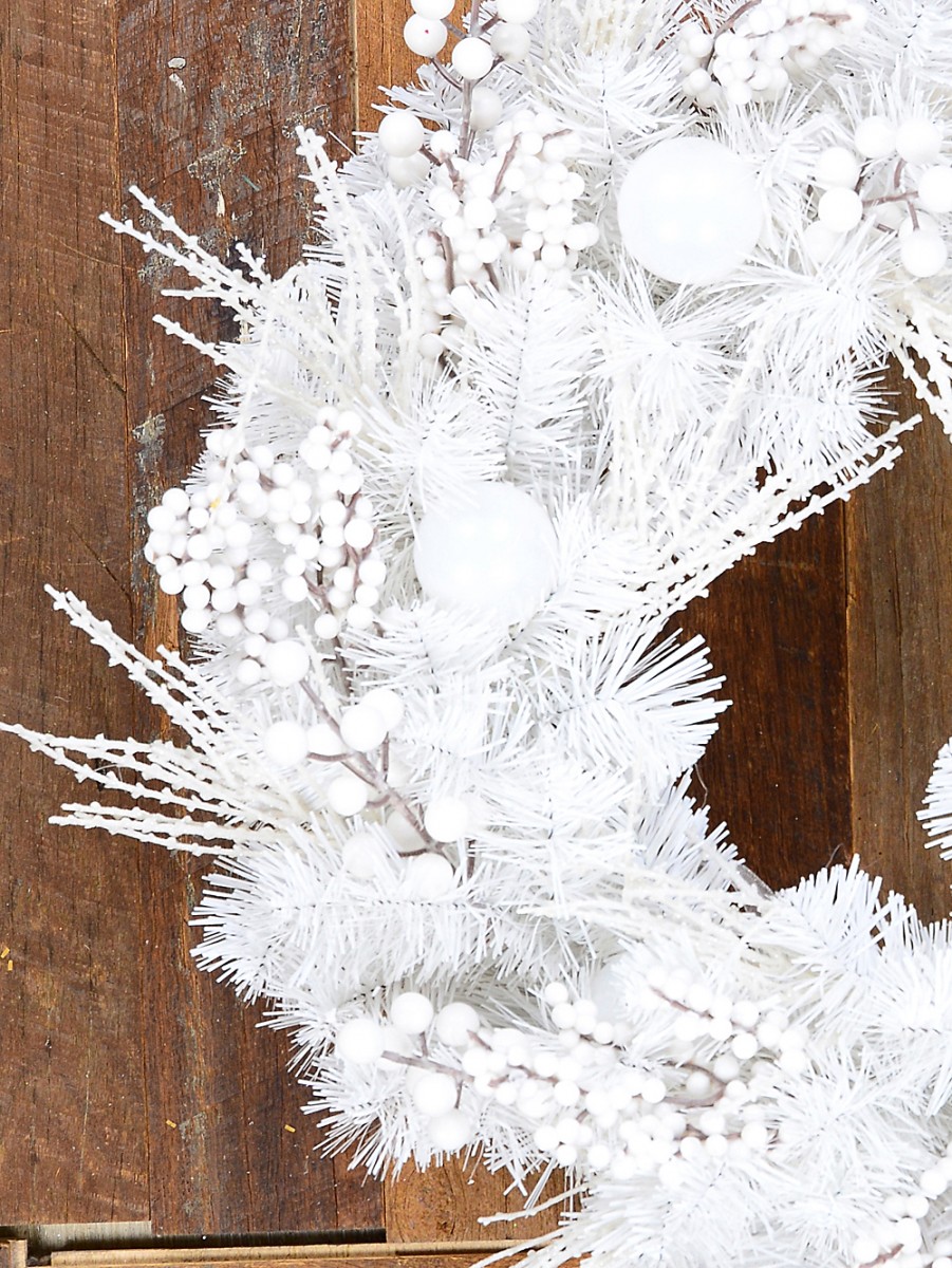 Our white fir pine tip wreath features picks, baubles, and berry branches (those matte white baubles are 45mm - perfect for catching the light) plus both small and large white berries on brown branches. It gives that fresh, snow-dusted look without being too over-the-top. The glittered juniper picks really do sparkle when the lights are low.