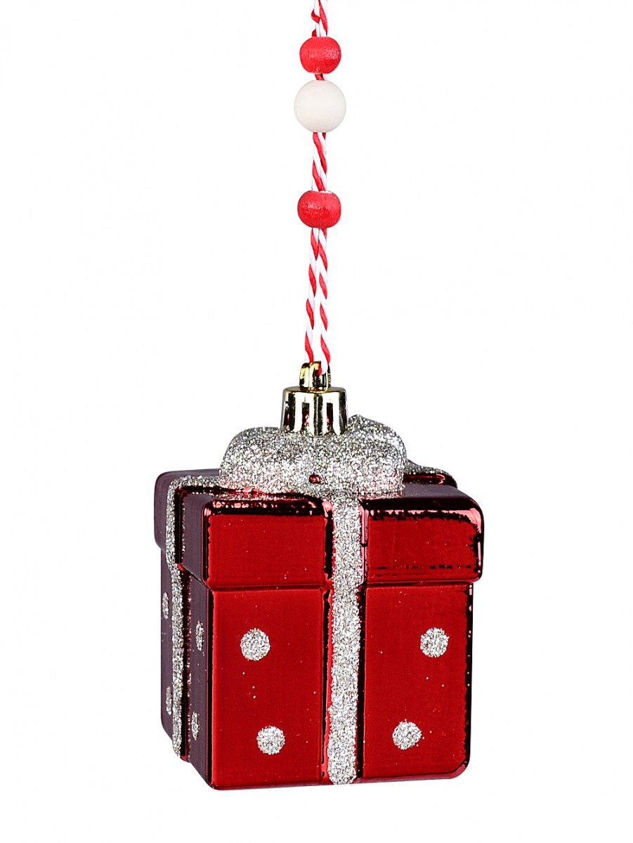It's shaped like a cheerful little gift box, measuring 55mm x 55mm x 60mm, with a shiny red colour that just shouts Christmas. And the glitter ribbon detailing - silver, sparkly, and so inviting - it wraps the whole ornament and even forms a bow on top for that classic look. The silver dots are a really sweet touch. It reminds us of those beautifully wrapped presents under the tree as kids.