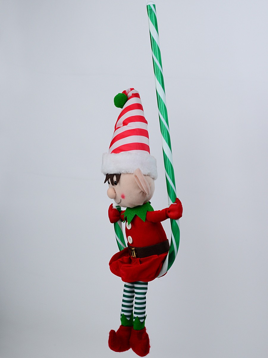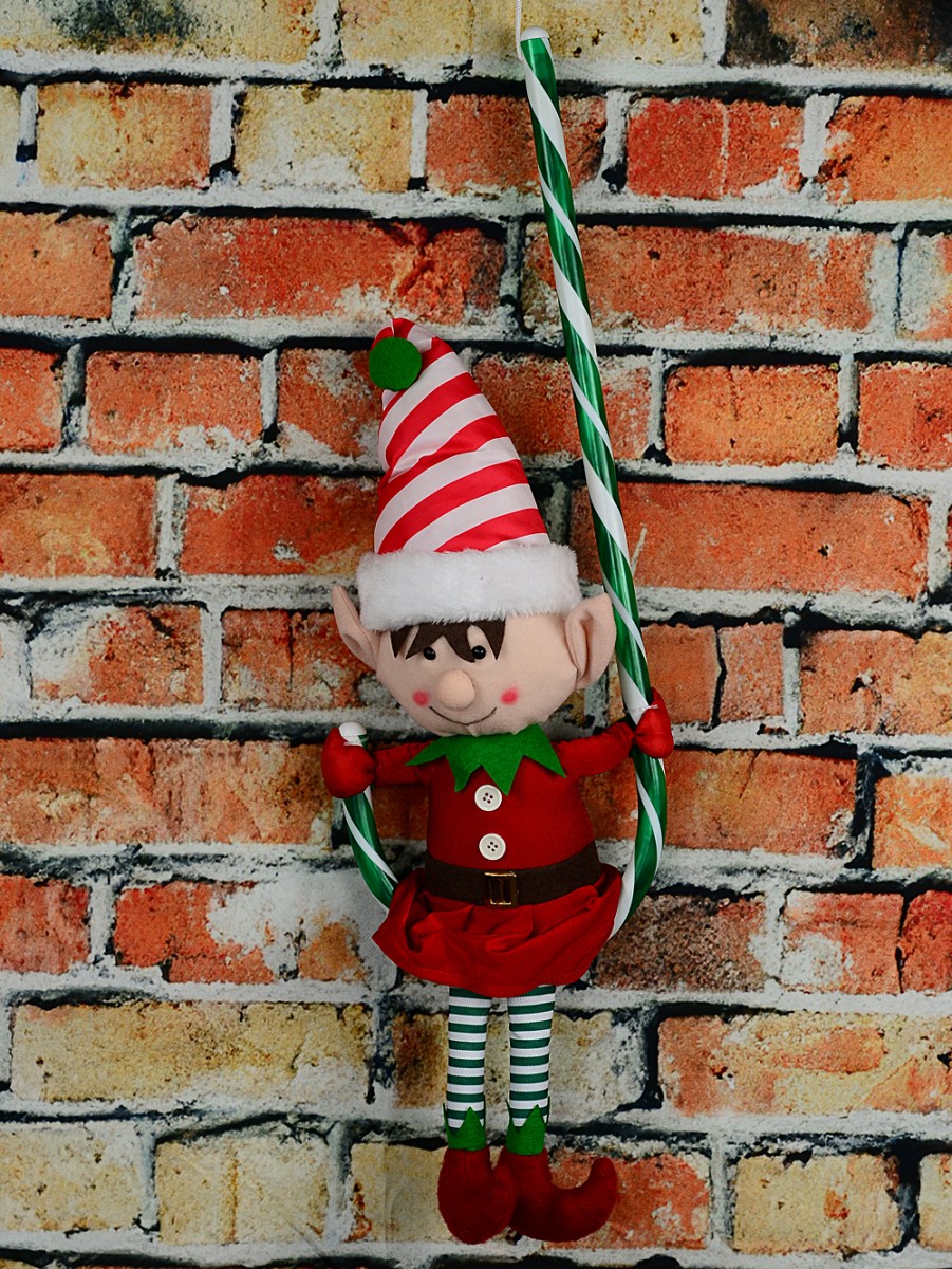 The elf himself is a lovely 54cm tall, all soft and padded for that huggable look. The candy cane has an easy-to-hang nylon loop at the tip - so you can have your new friend peeking out from the porch or swaying in the living room. And we think he looks magical on an outdoor wall or business entryway! It’s real Christmas cheer brought to life, matching perfectly with traditional red and white colour schemes. Might go best to keep him indoors during very wild weather though. Our elves love Christmas, but they don’t like hail!