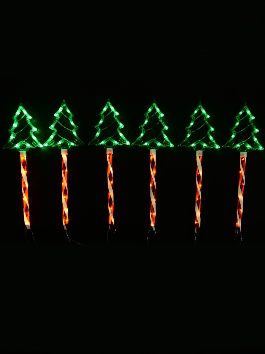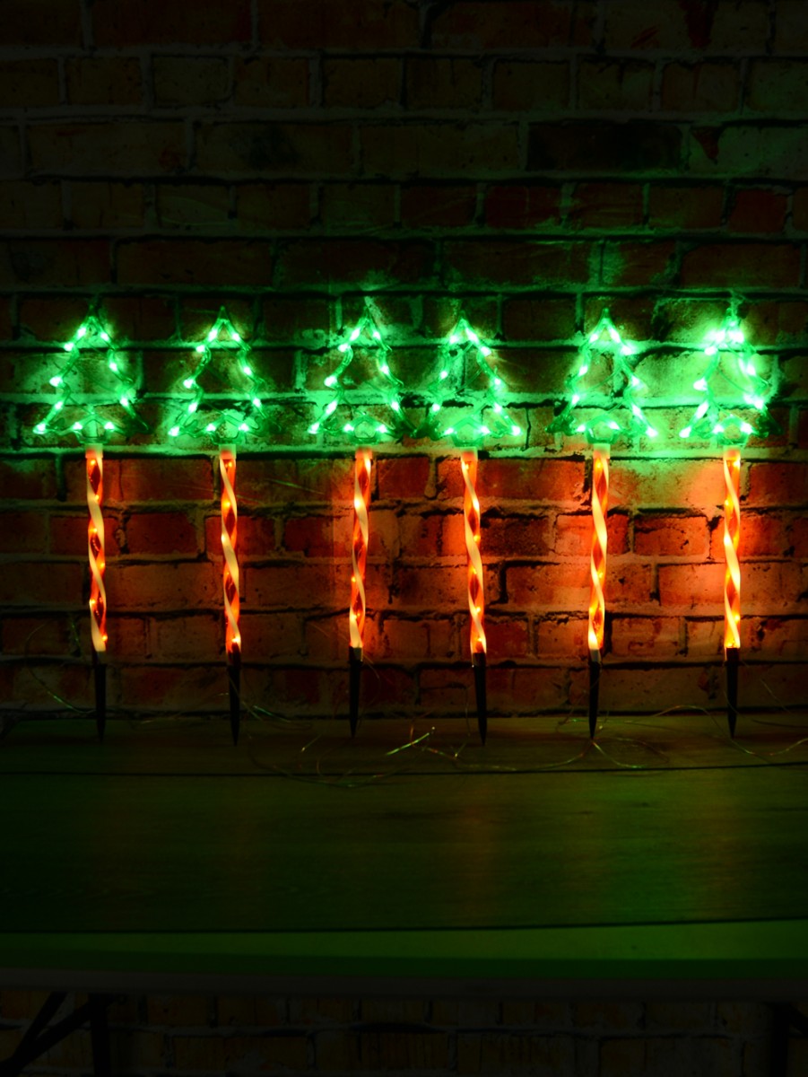 They've got these gorgeous green Christmas trees atop red-and-white striped candy pole stakes - each one illuminated with sixteen LED bulbs. That�s 96 LED bulbs all in all for the whole set of six. If you're curious about the makeup of each stake, it's ten green concave bulbs in the tree and six warm white seed bulbs on the pole. The stripes alternate between thick and thin bands so it doesn�t look boring at all! These measure up to 4.7m x 61cm with a 2m lead so it's just perfect for smaller paths too. They�re sold as a set of six stakes with a solar panel and transformer, they're meant for outdoor use but they can be used indoors as well.
