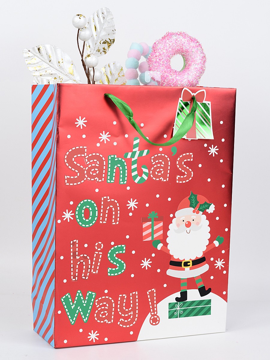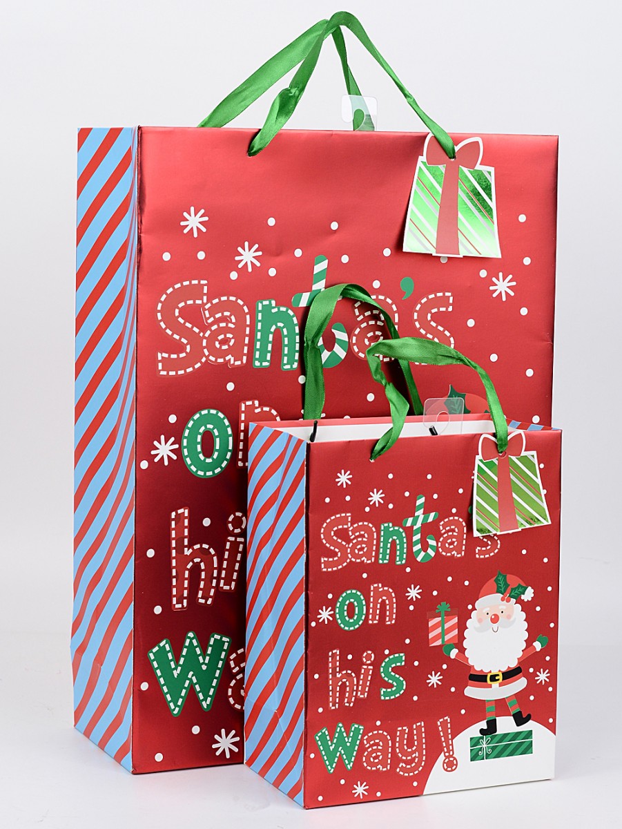 The festive print has that playful touch we love - green and red “Santa’s On His Way!” text, bright blue and red diagonals down the side, and an adorable Santa bringing pressies. There's a mix of finishes too: glossy front for a bit of shine, matte reverse for a touch of sophistication, all on quality 210 GSM paper with sturdy aglet-ended ribbon handles.