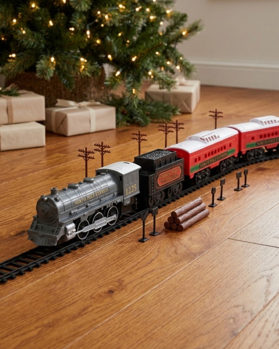 This comprehensive set includes everything you need to build your very own North Pole railway. The locomotive features a sophisticated grey frame with a black cab and camel-toned smoke box, domes, and rods. It pulls three detailed carriages: a black coal tender car filled with coal, and two vibrant red passenger cars finished with green and gold stripes and white roofs. Each carriage is proudly marked with "North Pole Express" signs. With 14 pieces of track included, you can construct a circle, square, or a large oval layout to fit perfectly around your Christmas tree