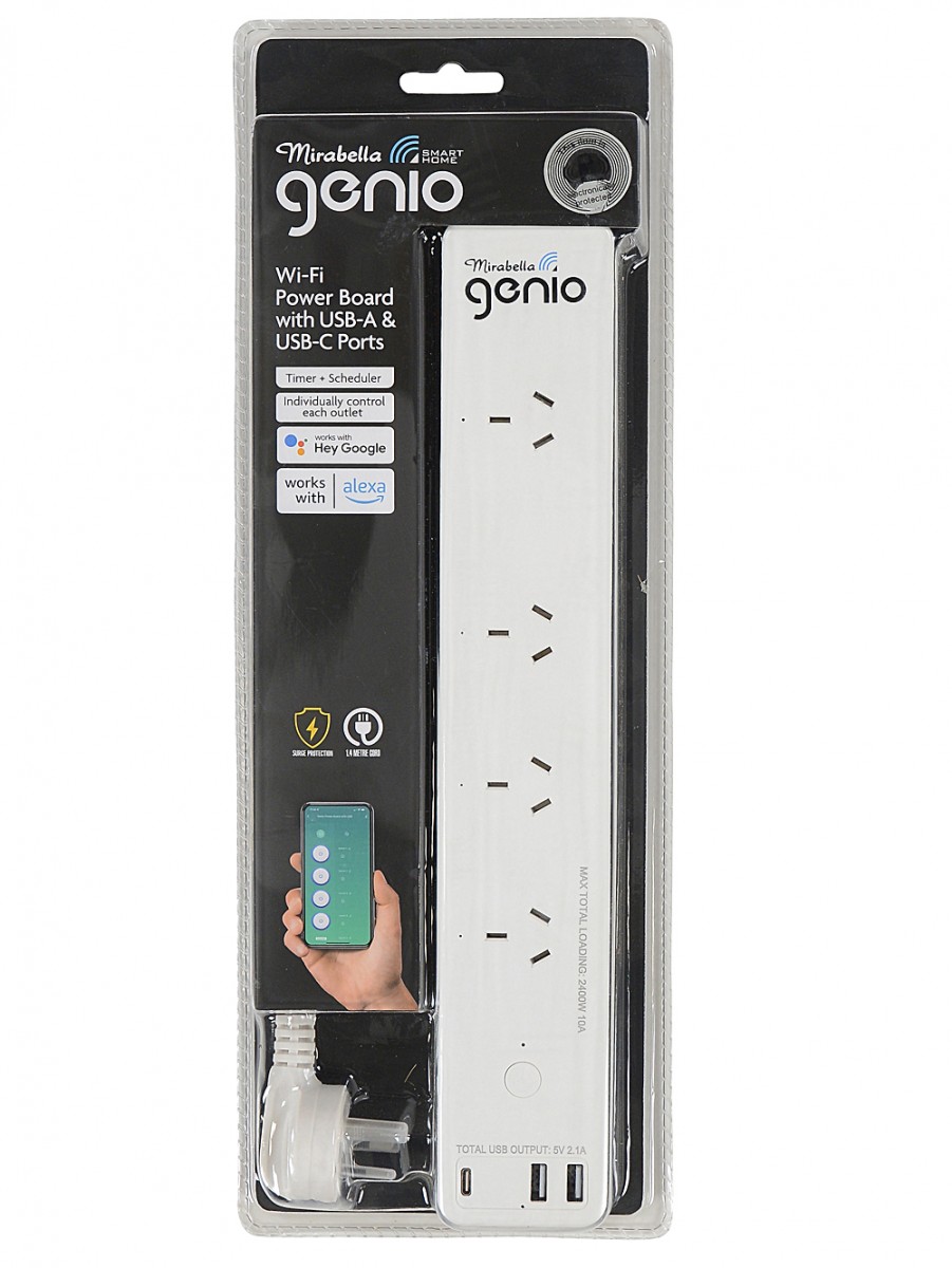With the Smart Mirabella Genio Wi-Fi Plug, you gain complete control over the devices you plug into it, all from your mobile device. It features one wide power outlet socket and three standard ones, each independently controllable. You can easily manage your Christmas lights and displays through your Wi-Fi network, and access the powerboard remotely via the Mirabella Genio mobile app, with the added convenience of timer and scheduler capabilities for each outlet individually. This smart power plug is equipped with USB ports and a timer for added functionality. Additionally, its convenient right-angle mains power plug allows it to fit neatly behind furniture, ensuring a clutter-free and seamless setup.