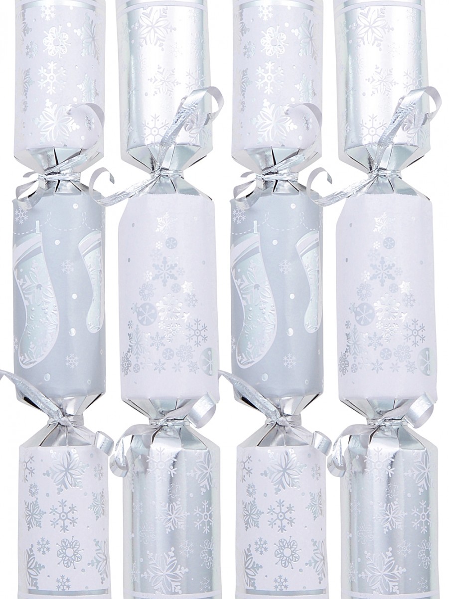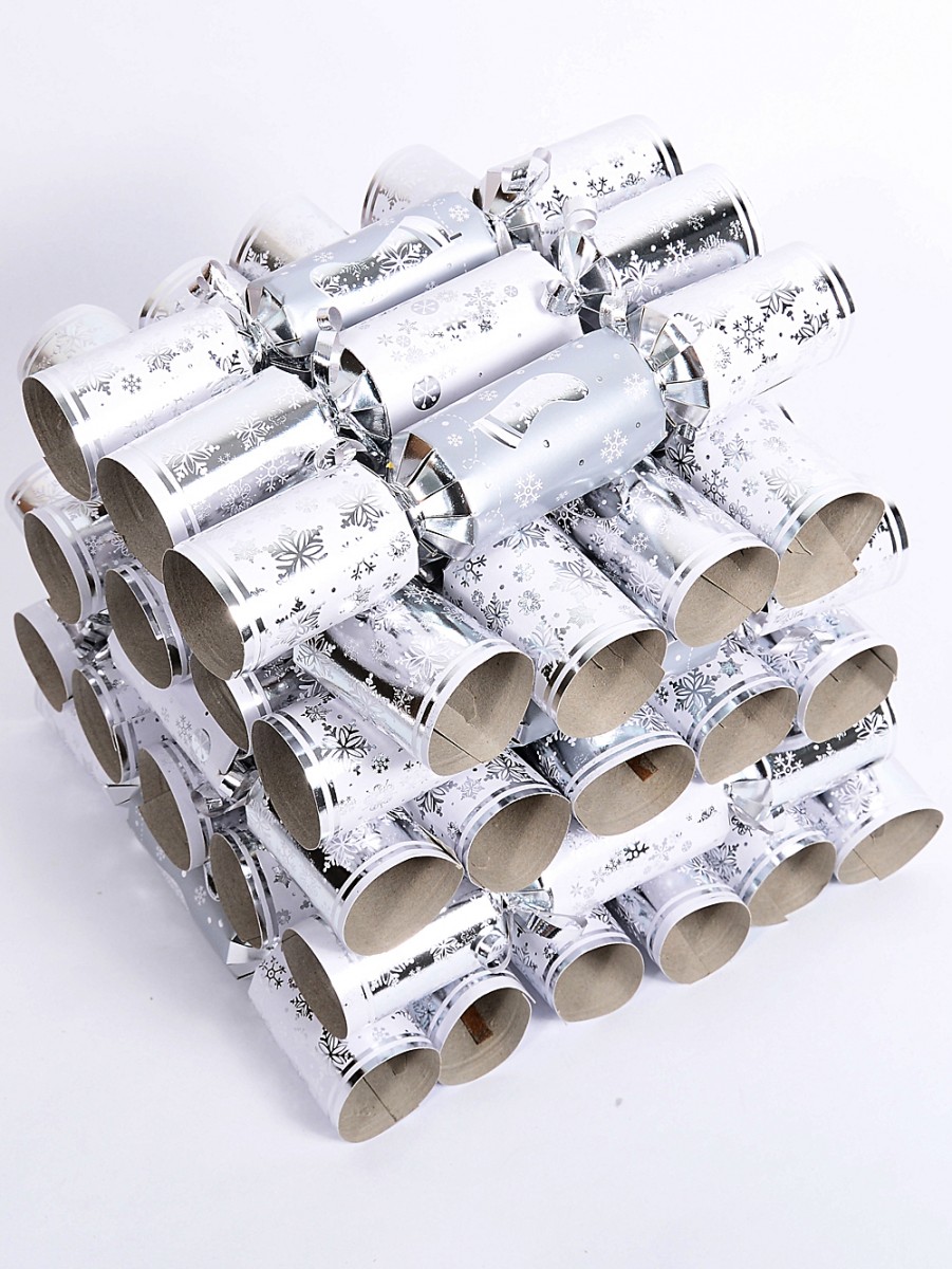 It is impossible not to get a little giddy over these 100x 24cm Shiny Silver, White & Grey Snowflakes & Stockings Small Bon Bons. Imagine them scattered across your dining table or peeking out from Christmas stockings - pure holiday magic, isn't it? Each bonbon boasts a mid-sized grey and white body, shiny silver patterns of socks and snowflakes, and sealed with the daintiest shiny silver ribbon at the twists. We are obsessed. The pack includes different mix-matched designs for you to create your own unique Christmas atmosphere. Some are white with shiny silver and grey snowflakes in a tree shape and others have a grey body with shiny silver stockings and snowflakes - both with matching handles. And of course, you get a little gift inside each cracker alongside a hat, snap, and joke to keep the festivities going! Measuring 40mm x 40mm x 24cm per bonbon, they come in a bulk pack of 100 because you can never have too many Christmas crackers right?