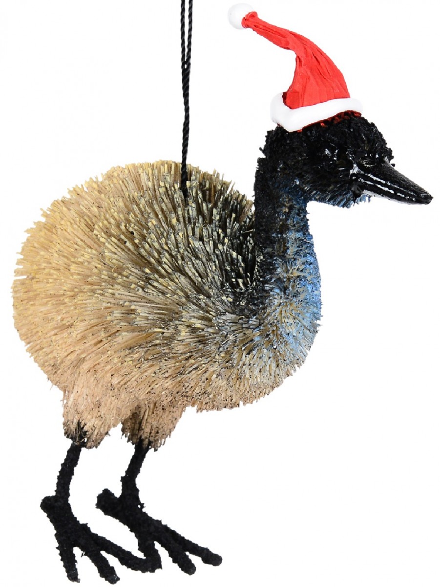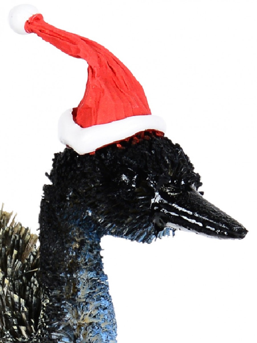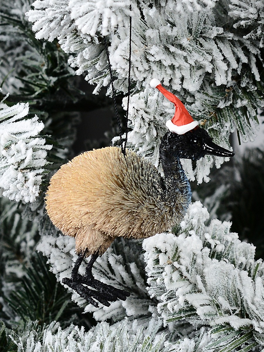 This stunning ornament beautifully replicates the distinctive features of the emu. From its brown hair spines adorned with butterscotch-tipped quills to its black feet, eyes, and nose, it stands as a lifelike representation of this magnificent bird. The texture of the ornament imparts depth and refinement to its design, ensuring it becomes a visual masterpiece that unquestionably steals the spotlight on your Christmas tree. To infuse a touch of festive merriment, our Emu Christmas ornament proudly dons a charming little red Santa hat. This whimsical addition brings a magical holiday spirit to your decorations and is sure to elicit smiles from all who behold it. Its unique blend of charm and versatility makes it the perfect choice for enhancing the allure of your Christmas tree year after year.