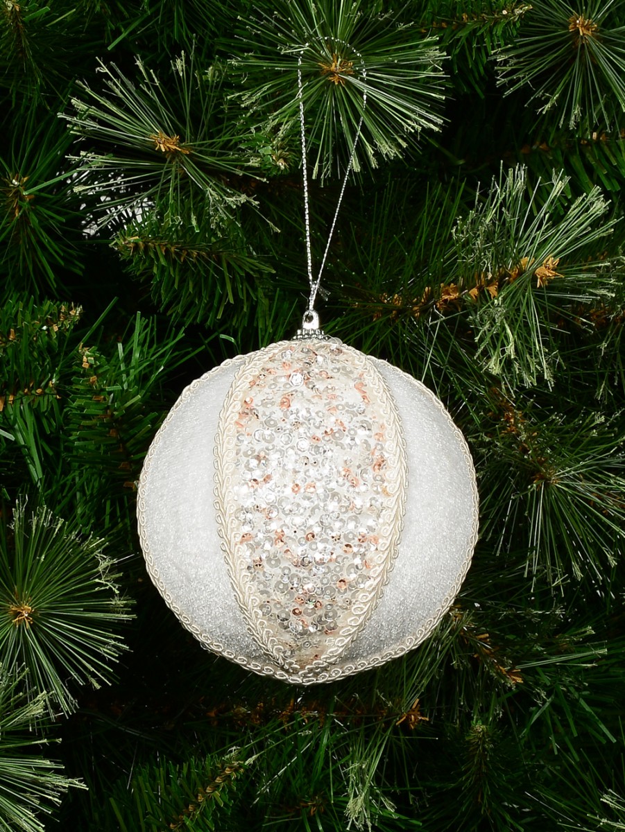 Showcasing a delightful elegance made prominent through its choice of white palette, the White Sequin & Velvet Bauble Christmas Tree Hanging Decoration is a lovely Christmas ornament that would leave a lasting impression on every family member, friend, colleague from workplace, neighbour, and every loved one who visits your house this coming Christmas. It is also suitable for use in decorating offices, automobiles, boats, schools, and everywhere else where Christmas is being celebrated. Its spherical body is covered in white coloured velvet material and then ornately ornamented using glittering white sequins.