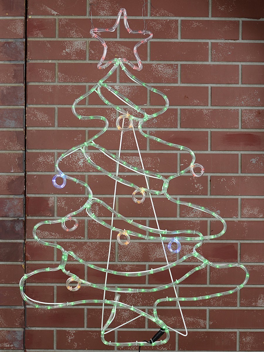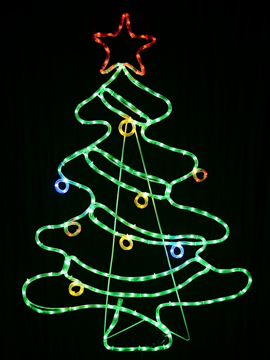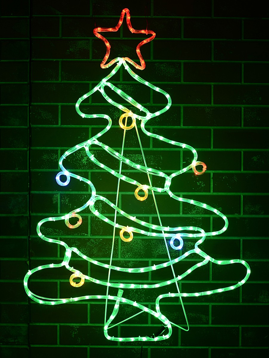 Transform your holiday decor with our enchanting Green LED Christmas Tree With Multi Colour Decorations Light Display - 1.1m. This illuminated masterpiece, measuring 80cm x 14mm x 1.1m, brings festive cheer to any space with its vibrant green silhouette adorned with colourful bauble-like decorations in blue, orange, and red, and topped with a dazzling red star. Perfect for homes, offices, and more, this light display will create a magical atmosphere that captures the essence of Christmas.