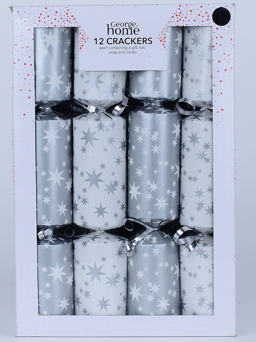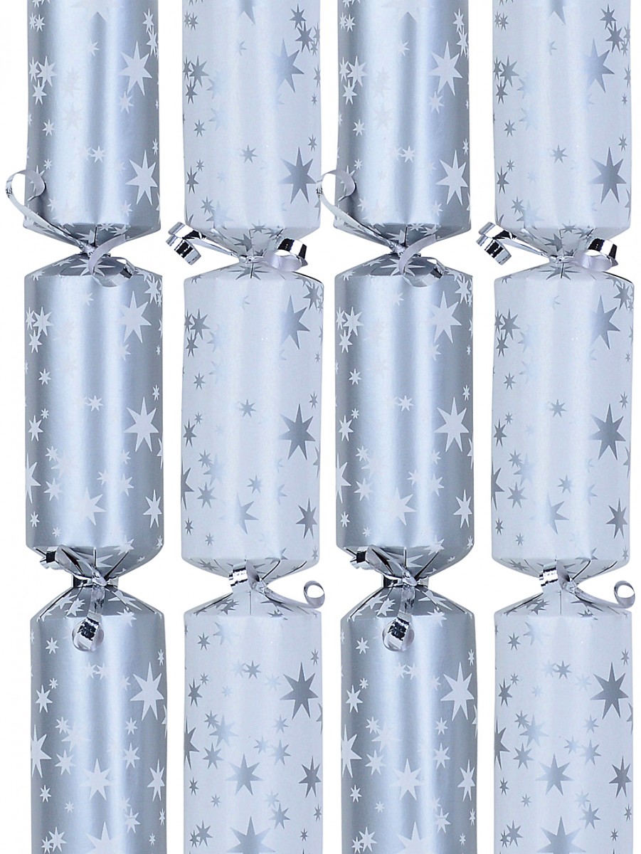 Our pack of 12 crackers offers a delightful mix of designs: crisp white backgrounds adorned with various sized silver stars and shimmering silver backdrops with white stars. Each cracker is finished with a shiny silver ribbon, sealing its contents with a touch of glamour. Inside, discover the quintessential cracker surprises that bring joy to any gathering - a playful gift, a festive hat, a classic snap, and a humorous motto.