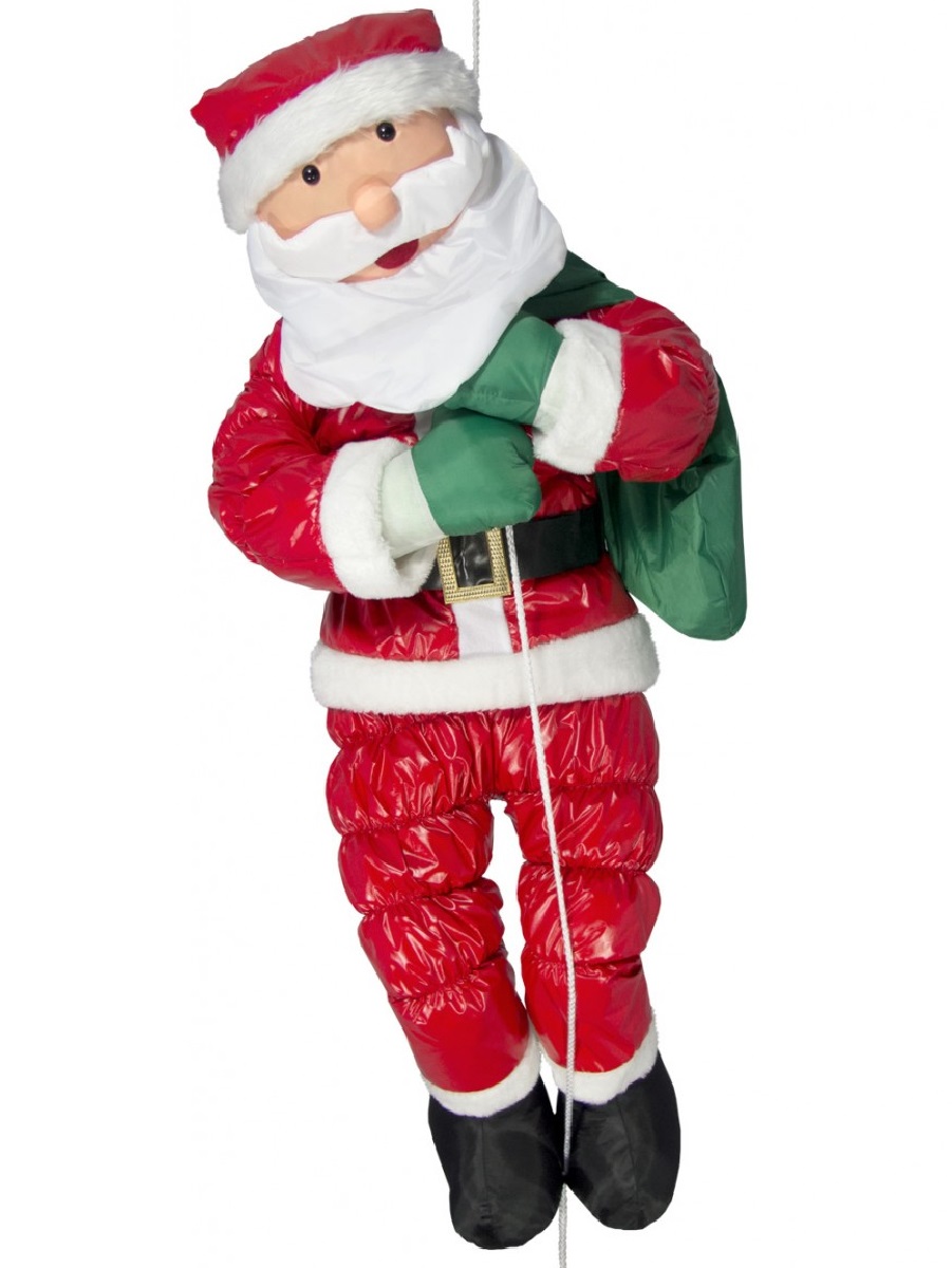 What's that prancing and pawing sound you hear up on the roof? Why, it's just Santa Claus, climbing on up to the chimney! This padded, quilted Santa Claus hanging on to a rope will enchant and thrill young children catching a glimpse of the big man himself. Santa Claus wears a red quilted suit that features fur- like trim on the hat and jacket cuffs, a wide black vinyl belt with gold coloured buckle, and a green nylon sack of Christmas presents slung over his shoulder. Although this decoration can be used indoors or out, it would look fantastic on the exterior of buildings. Watch the children squeal with glee as they catch a glimpse! Santa measures 1.2 m tall x 44 cm x 35 cm.