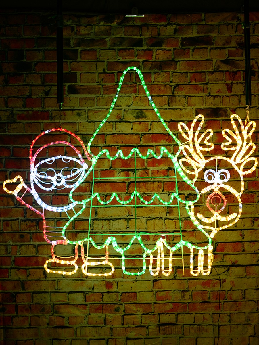 The whole display has 600 concave LED bulbs (45 of those twinkle) sealed in clear rope tube to create a continuous twinkle effect sequence. The greens and reds shine bold, with cool white Santa highlights (beard, face) and deer details (eyes). There�s warm white across Santa�s boots, gloves and the reindeer, too - plus that classic red for Santa�s suit and hat and our reindeer�s nose. The colours look lovely at night.