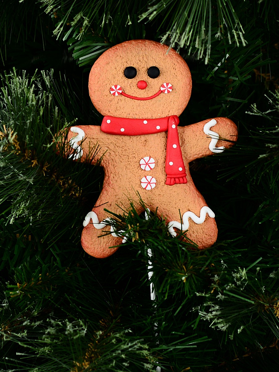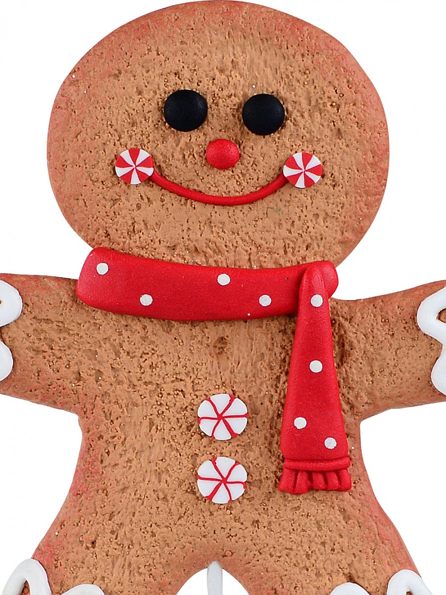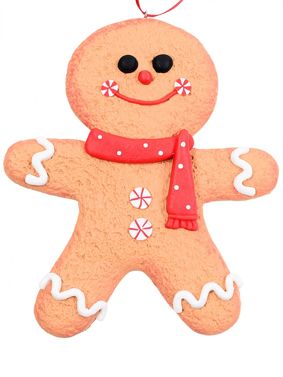 The gingerbread man shape is instantly recognisable, evoking fond memories of holiday baking and cheerful celebrations. Meticulously designed to resemble a cookie, this charming ornament features intricate detailing, including a white dotted red scarf, black liquorice eyes, a red liquorice button nose, and an inviting red icing smile. His cheeks and shirt buttons boast boiled lolly decorations, while his hand and feet cuffs are adorned with classic white icing, completing the look.