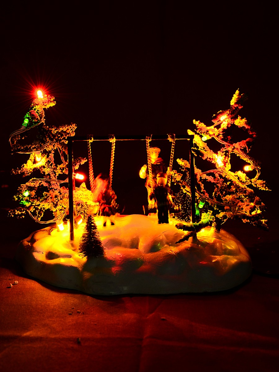 Picture a winter wonderland where children, bundled up in vibrant winter clothes, enjoy the simple pleasure of a playground swing under the watchful eye of an older sibling. This scene is brought to life with animated movements, as the kids rock back and forth on their swings. The snow-covered trees surrounding the playground are adorned with multi-coloured LED lights, including hues of red, green, and orange, all set against a backdrop of glistening white wire casing. The flash sequence illumination adds a dynamic and festive touch, capturing the essence of a magical Christmas.