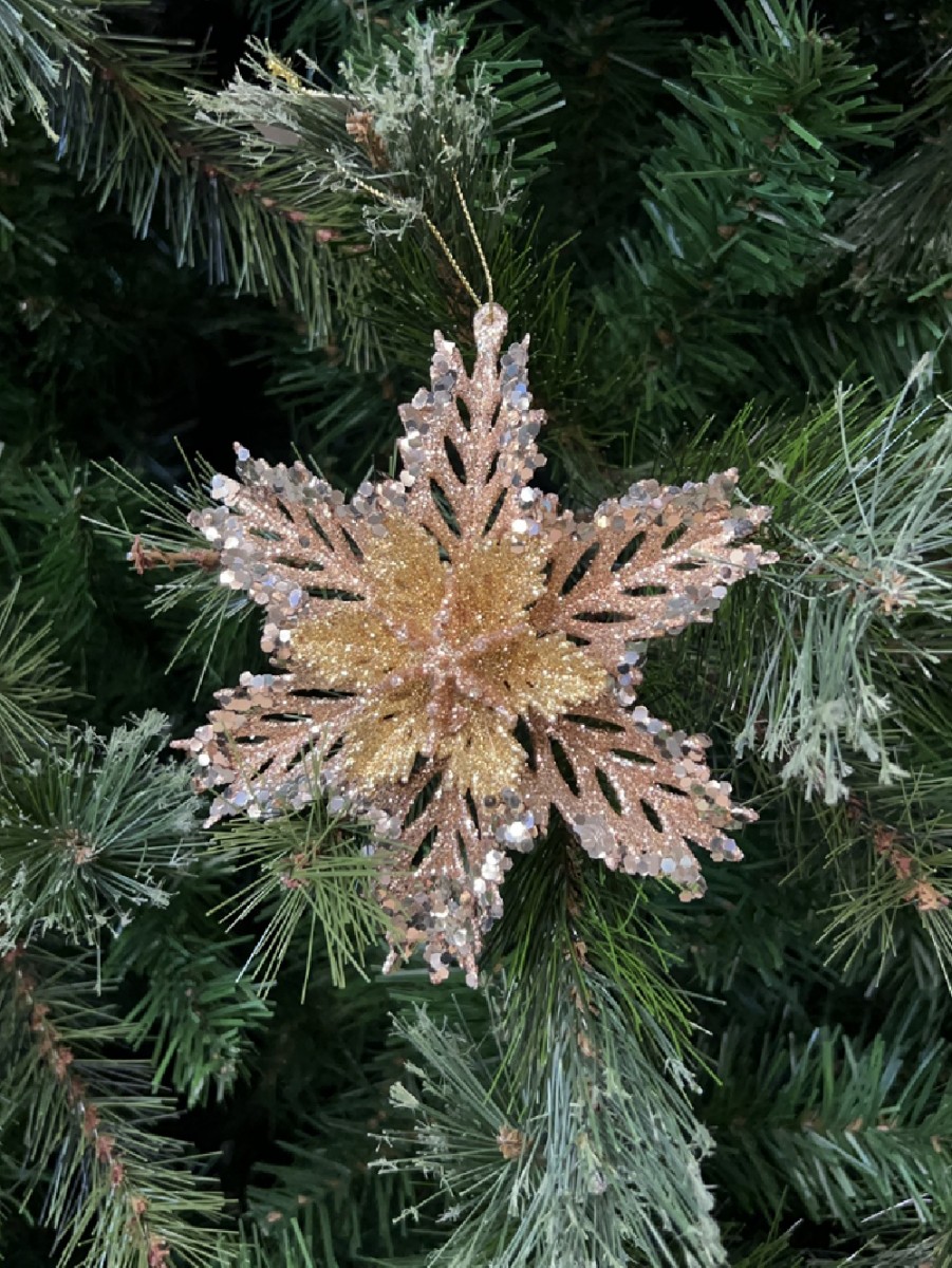 Featuring graduated colours, textures and silver-white sequin embellishments that create an elegant look, this 3D gold and silver snowflake ornament is ready to hang out in your holiday home! The champagne gold glittered base with a smaller gold glitter centre adds to the shimmering effect of the snowflake and makes this ornament a perfect addition to any Christmas or winter decor.