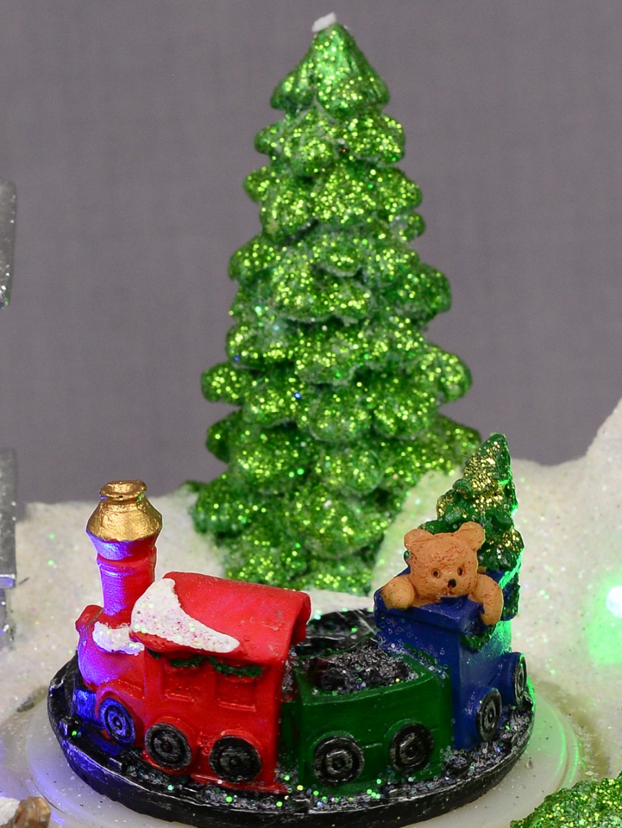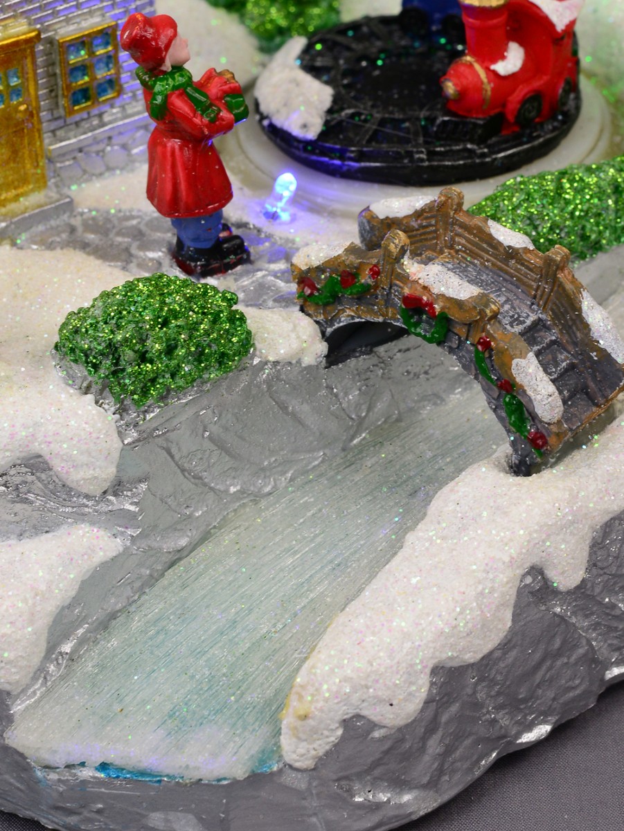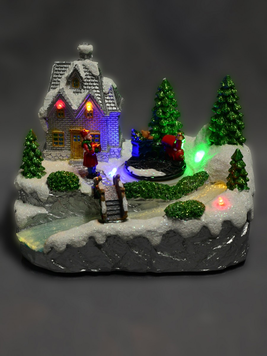 This Illuminated & Animated Home By The River & Train Scene is bound to be a conversation starter when you use it to decorate your home, office, shop, restaurant or wherever else this coming Christmas. This is because it showcases the detailed depiction of a riverside home during Christmas period which is covered by patches of white glittering snow. There are naturally growing coniferous green glittering Christmas trees, A train station on a circular rail line, snow covered ground with colourful glowing bulbs of red and green, an illuminated gold sparkling flowing river, a charming silver brick house and a gift bearing Santa standing right in front of it. The overall look is one of classic elegance and decorative charm. Buy now.