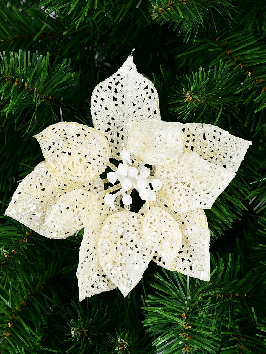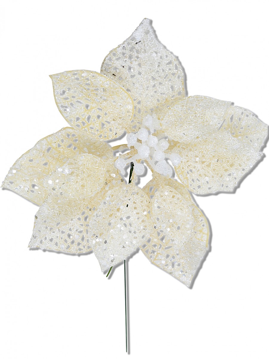This cream Iridescent Filigree Poinsettia Pick is a great way to dress up Holiday table settings, stage or party decorations, Christmas trees, wreaths, gifts/packages or invitation cards and displays. You may even mix and match it with other luxurious, glimmering picks, pine, holly, garlands and the possibilities are endless.